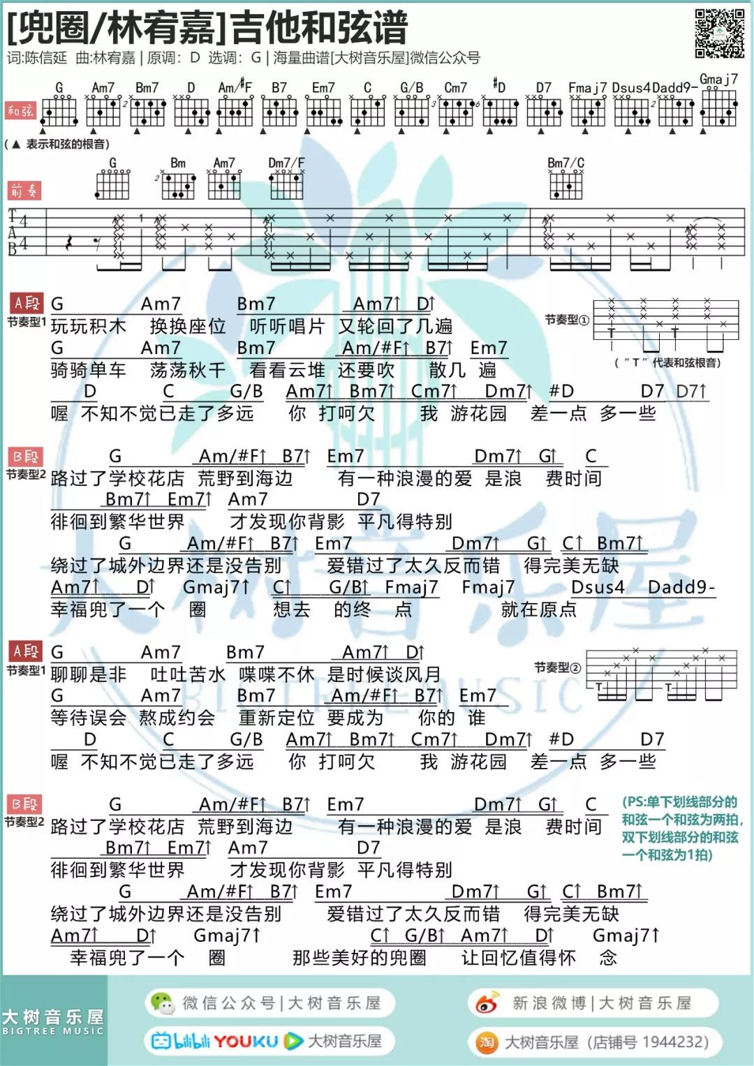 曲谱介绍: 林宥嘉《兜圈》吉他弹唱谱,采用G调指法编配,共有1张高清图谱,免翻页排版设计。
