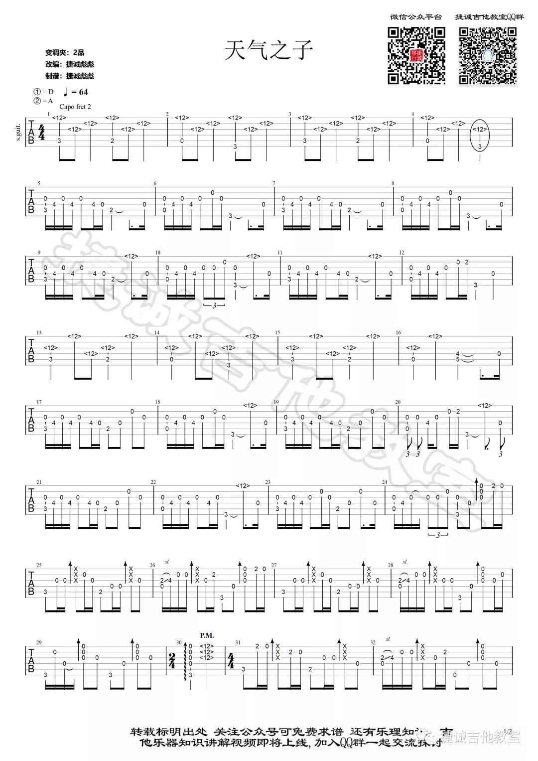 曲谱介绍: 游戏动漫《天气之子》吉他独奏谱,采用D调指法编配,共有3张高清图谱。