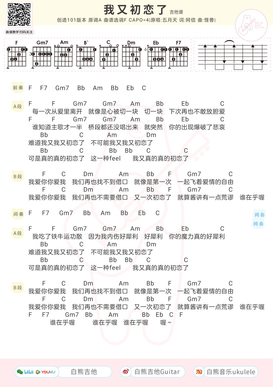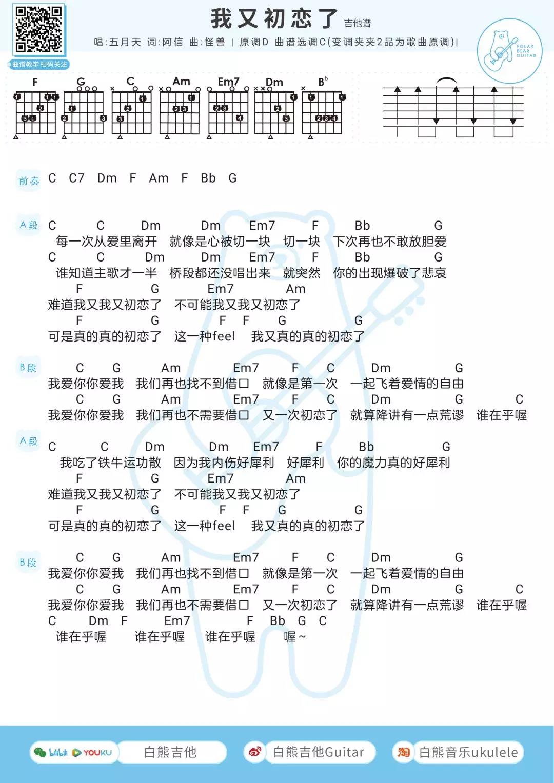 曲谱介绍: 五月天《我又初恋了》吉他弹唱谱,采用F调指法编配,共有2张高清图谱,免翻页排版设计。