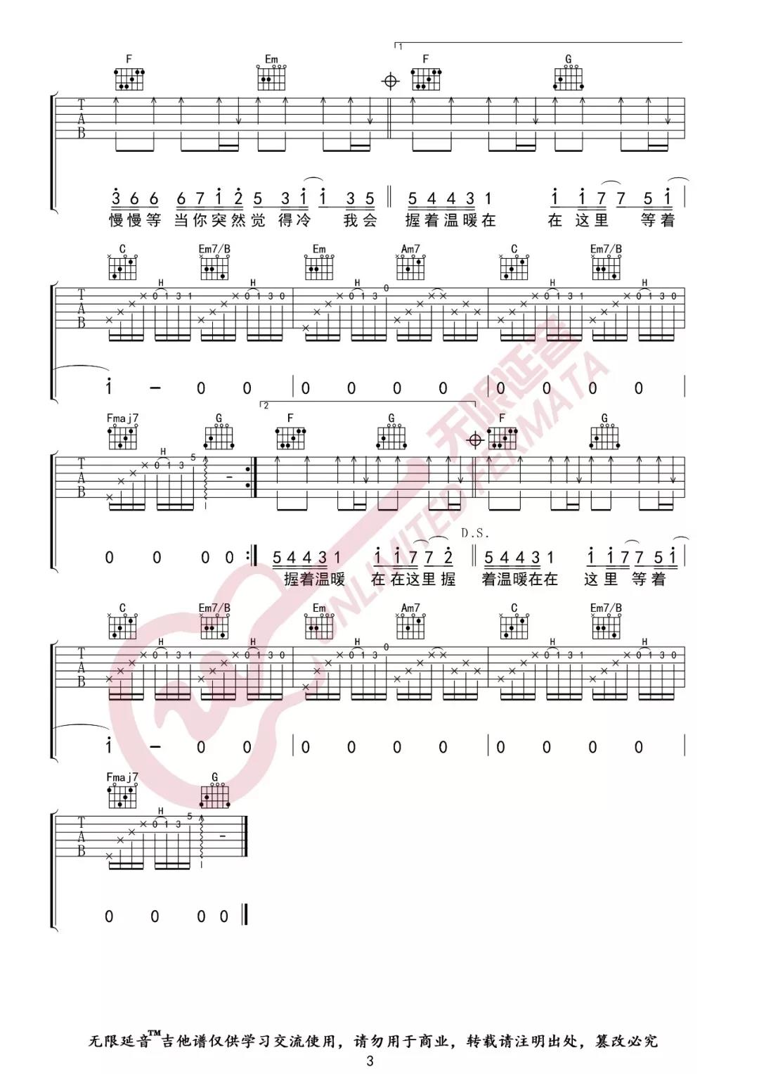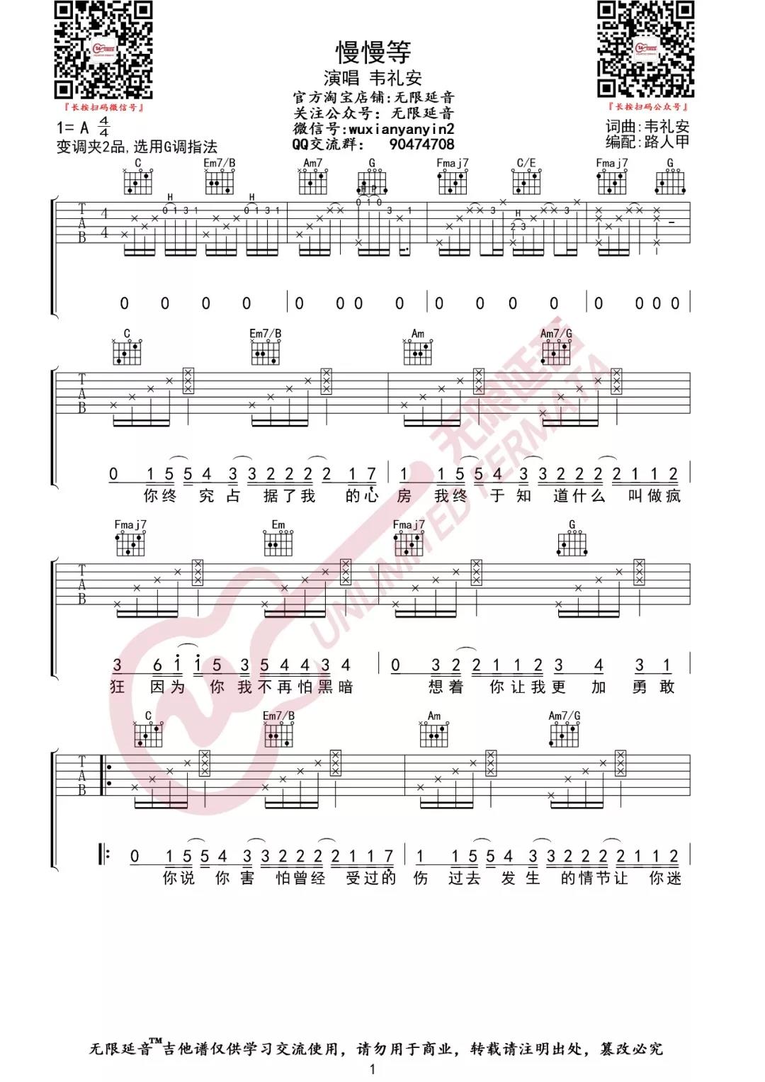 曲谱介绍: 韦礼安《慢慢等》吉他弹唱谱,采用G调指法编配,共有3张高清图谱。