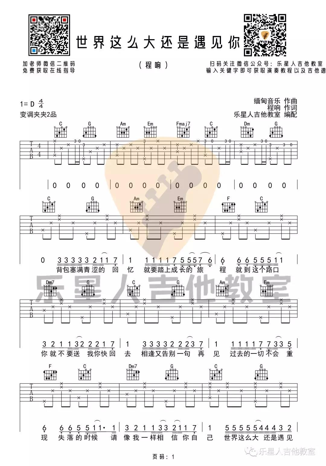 曲谱介绍: 程响《世界这么大还是遇见你》吉他弹唱谱,采用D调指法编配,共有3张高清图谱。