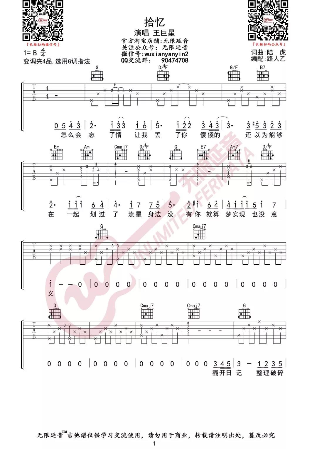 曲谱介绍: 王巨星《拾忆》吉他弹唱谱,采用G调指法编配,共有3张高清图谱。