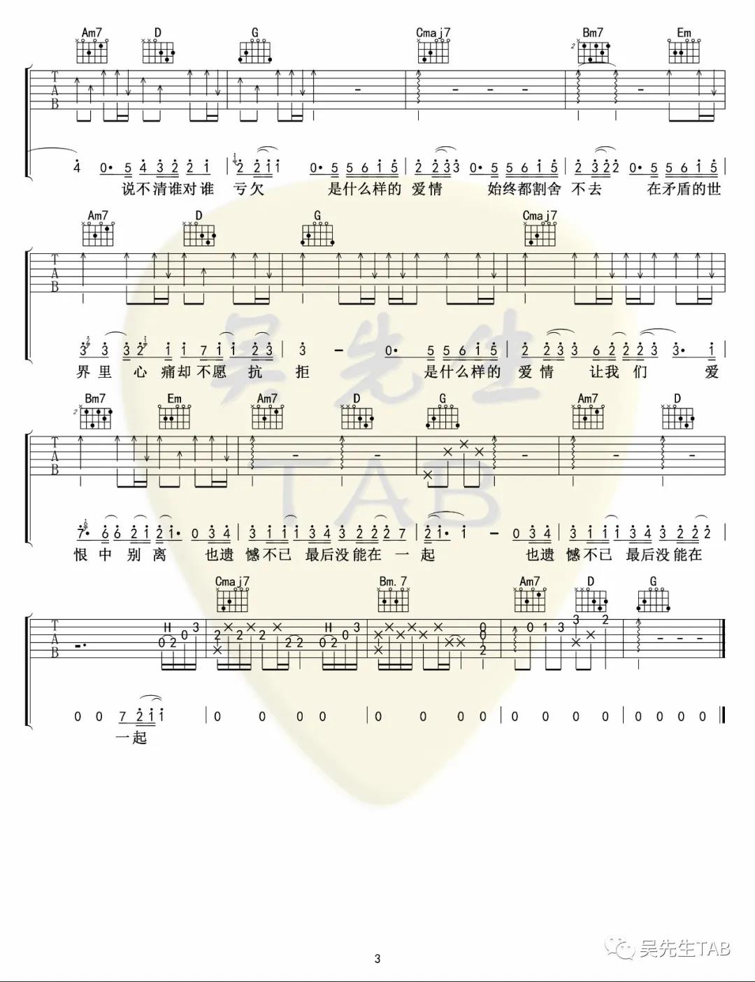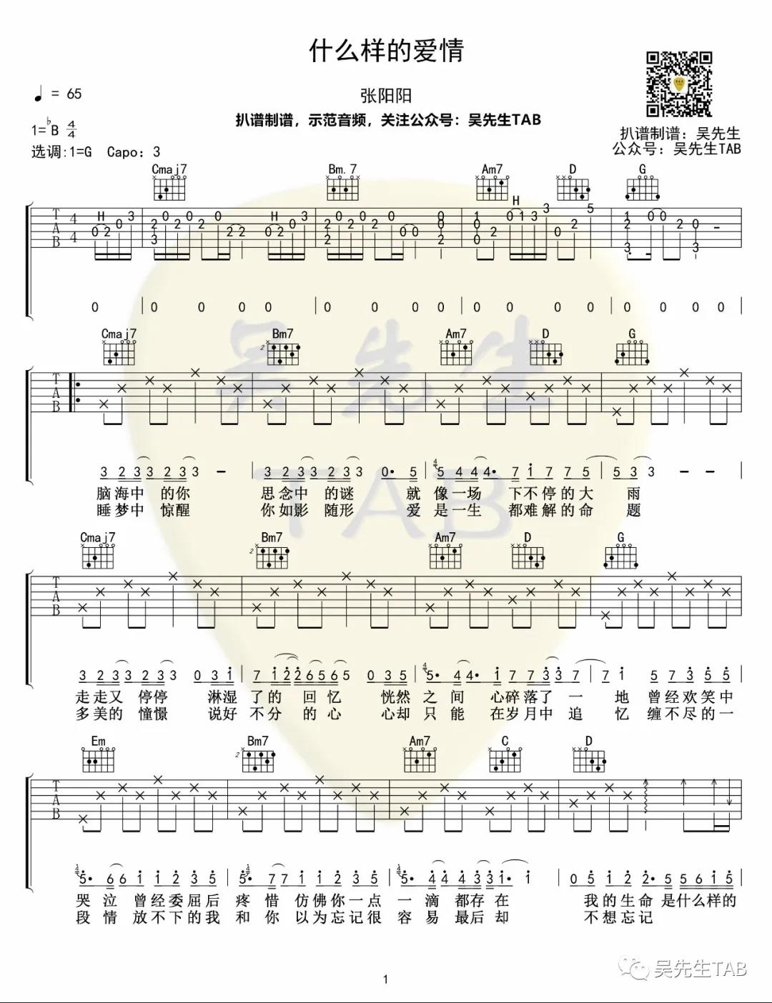 曲谱介绍: 张阳阳《什么样的爱情》吉他弹唱谱,采用G调指法编配,共有3张高清图谱。