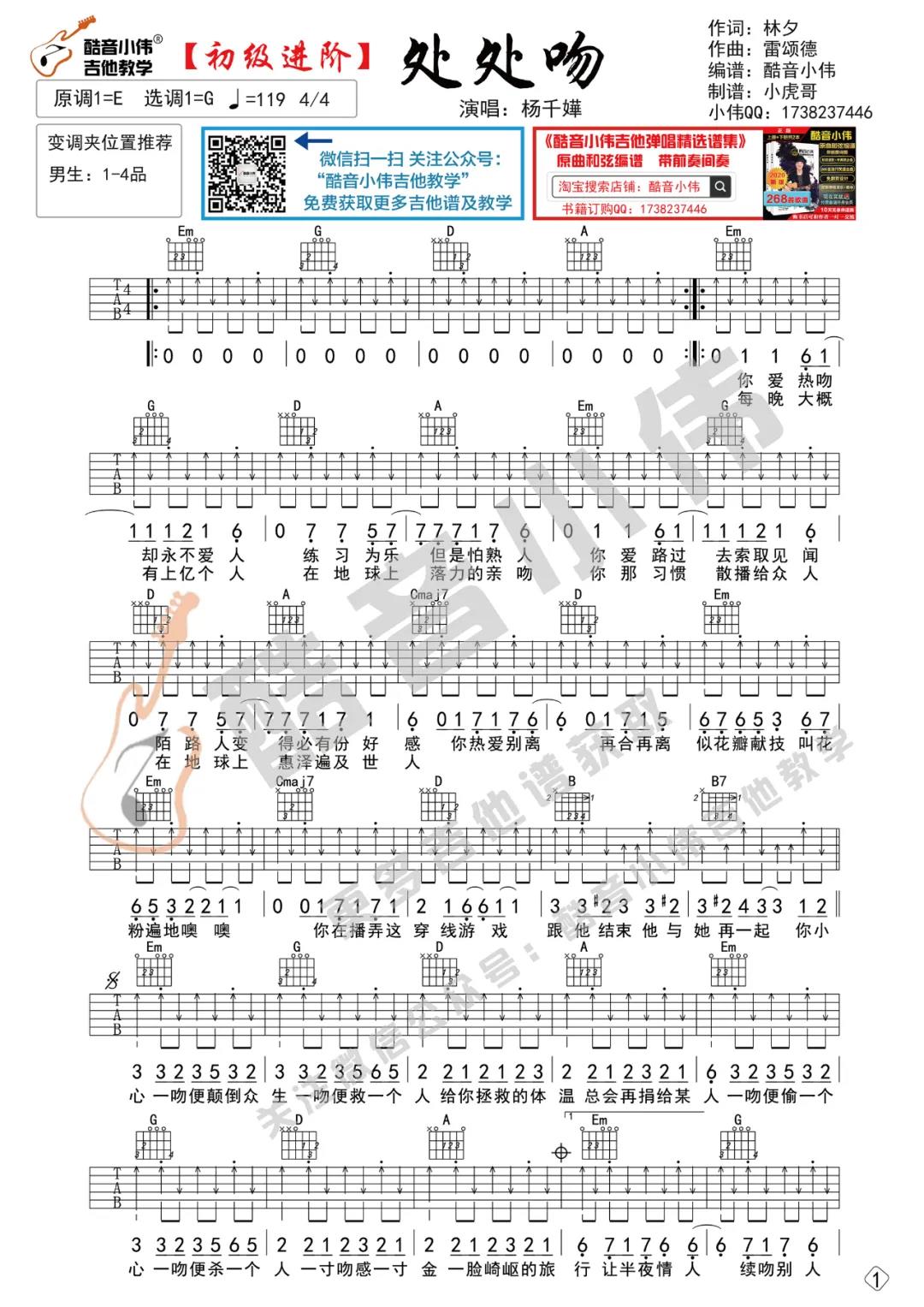 曲谱介绍: 杨千嬅《处处吻》吉他弹唱谱,采用G调指法编配,共有2张高清图谱,免翻页排版设计。