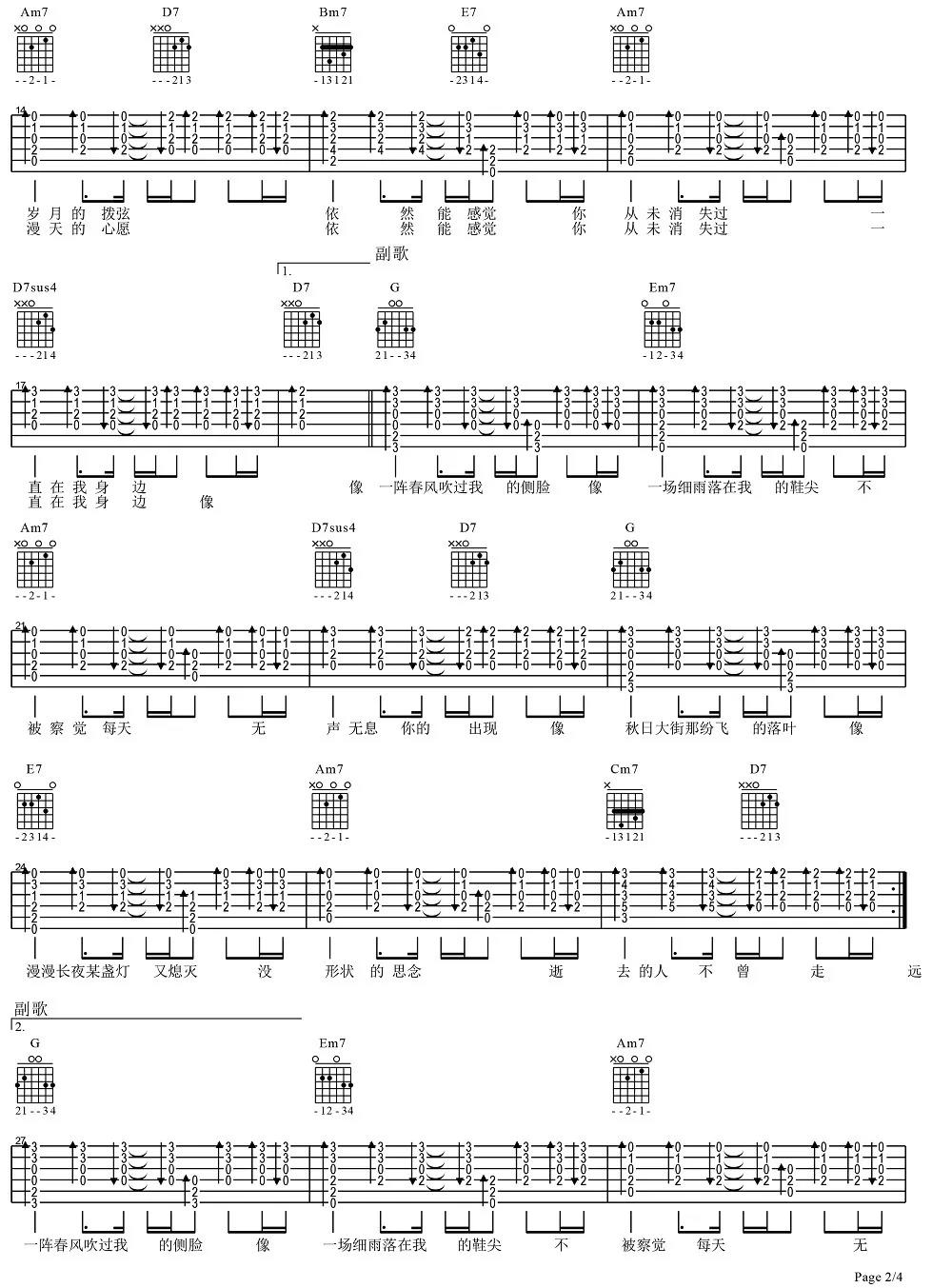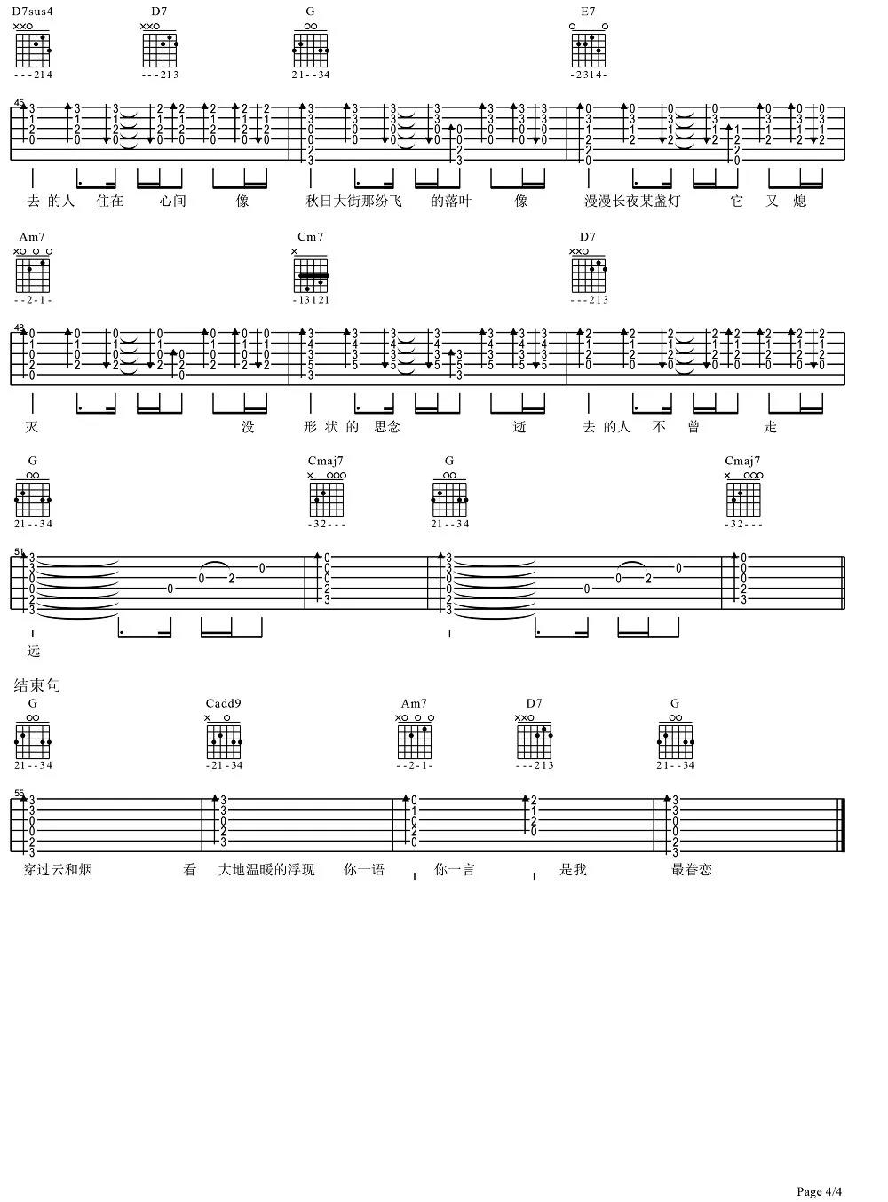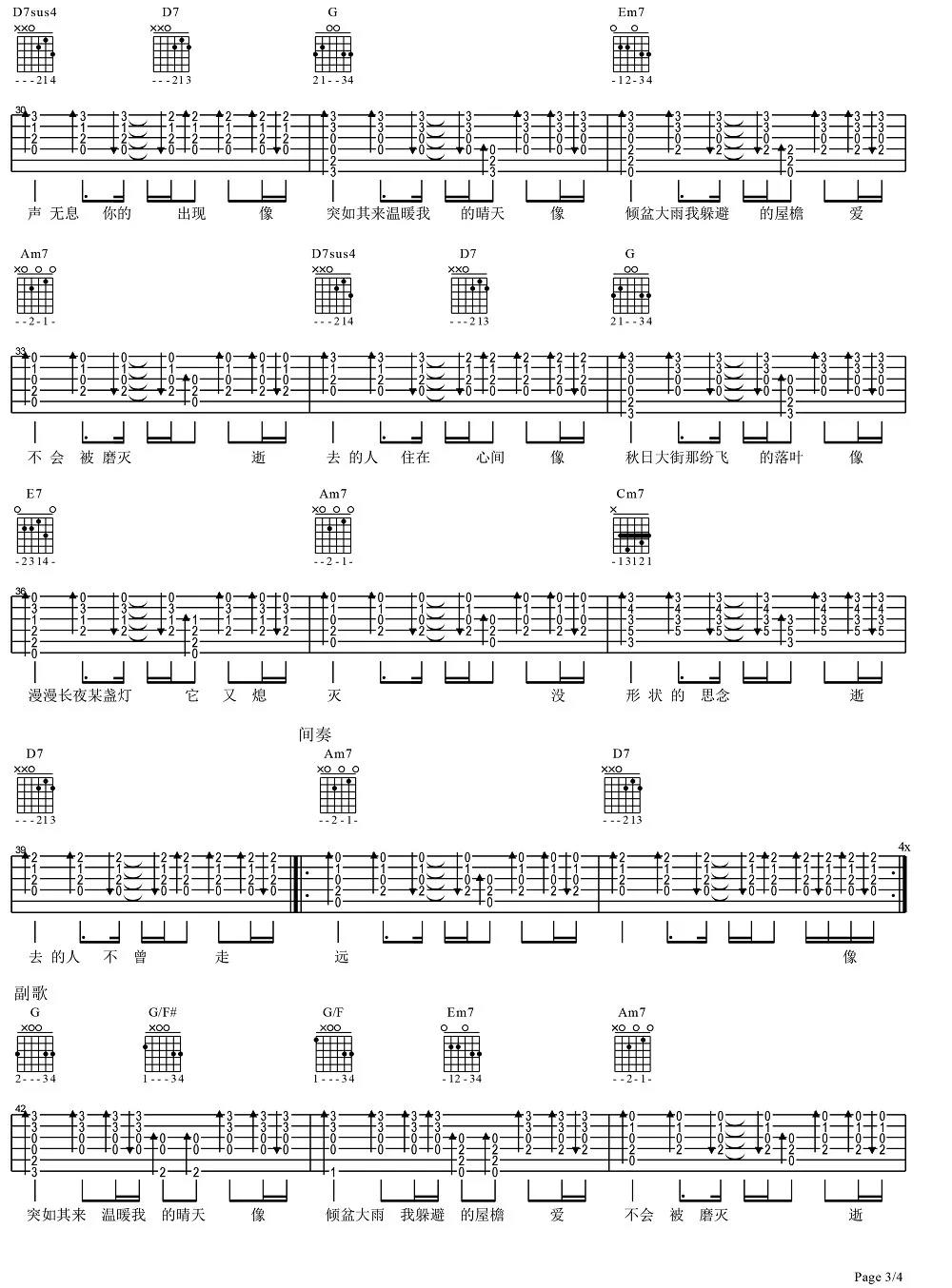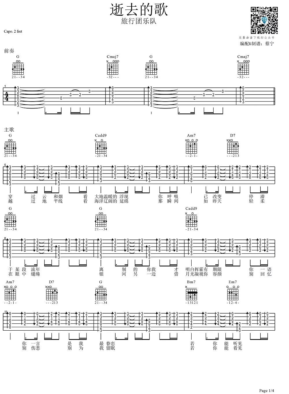 曲谱介绍: 旅行团《逝去的歌》吉他弹唱谱,采用G调指法编配,共有4张高清图谱。