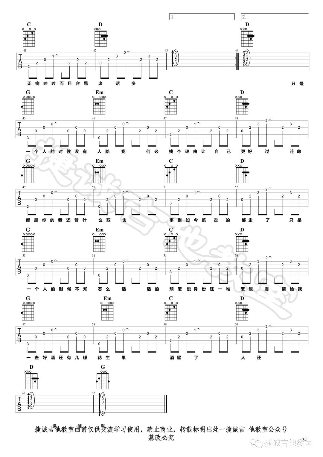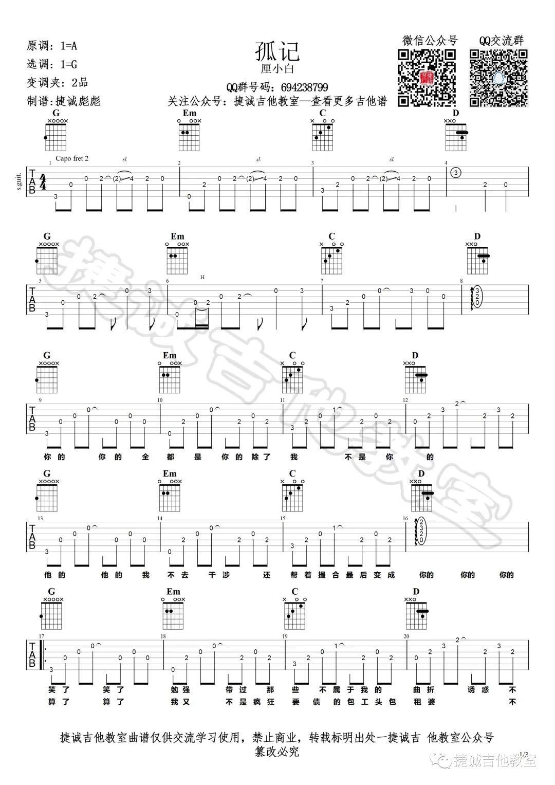 曲谱介绍: 厘小白《孤记》吉他弹唱谱,采用G调指法编配,共有3张高清图谱。