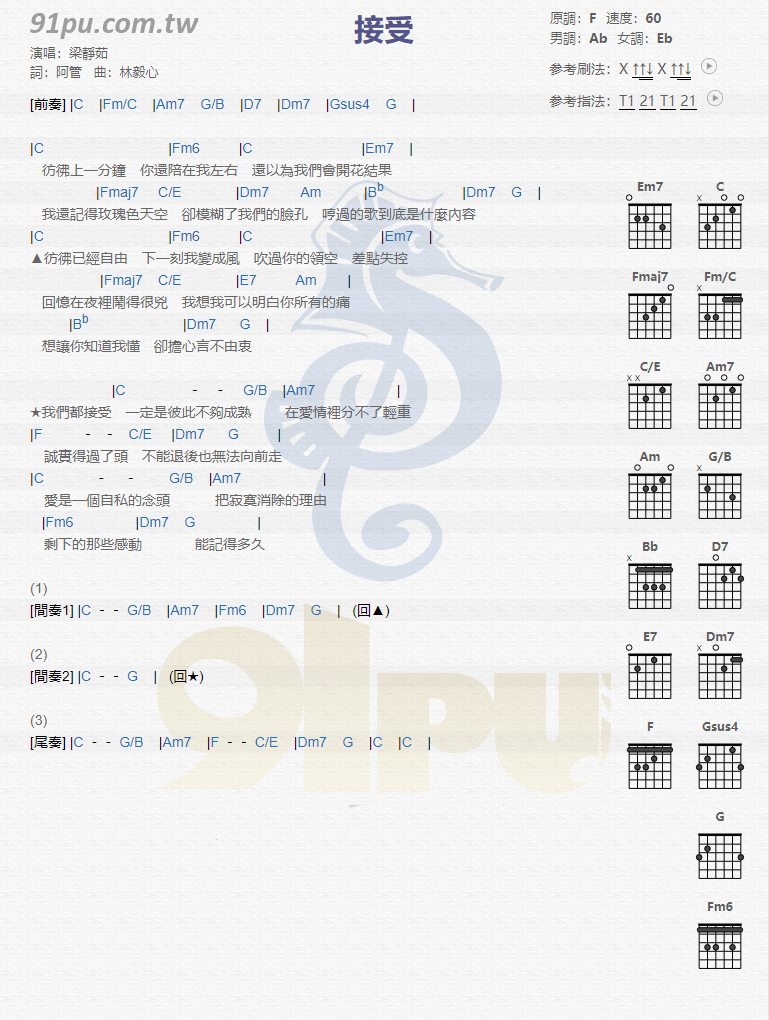 曲谱介绍: 梁静茹《接受》吉他弹唱谱,采用F调指法编配,共有1张高清图谱,免翻页排版设计。