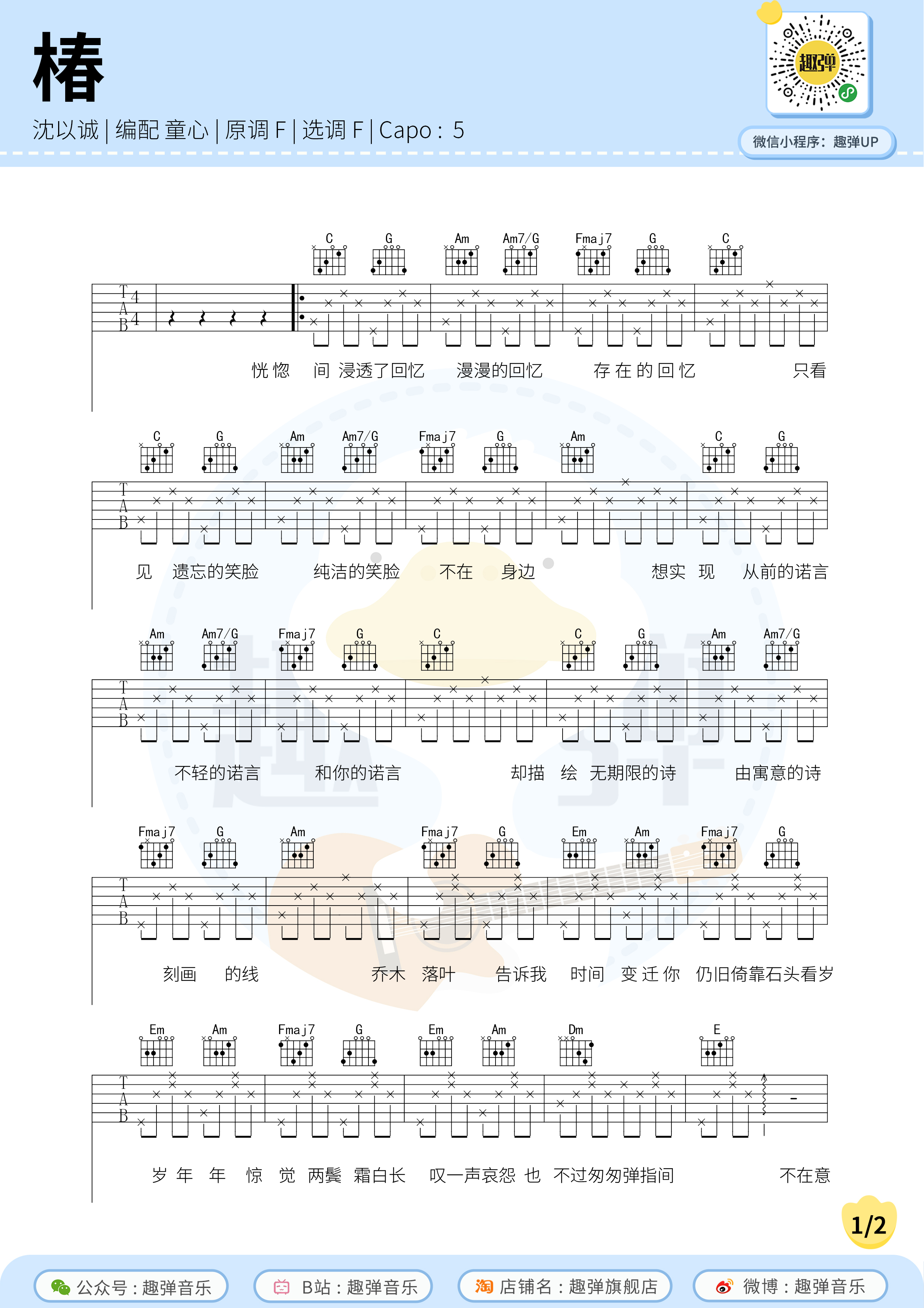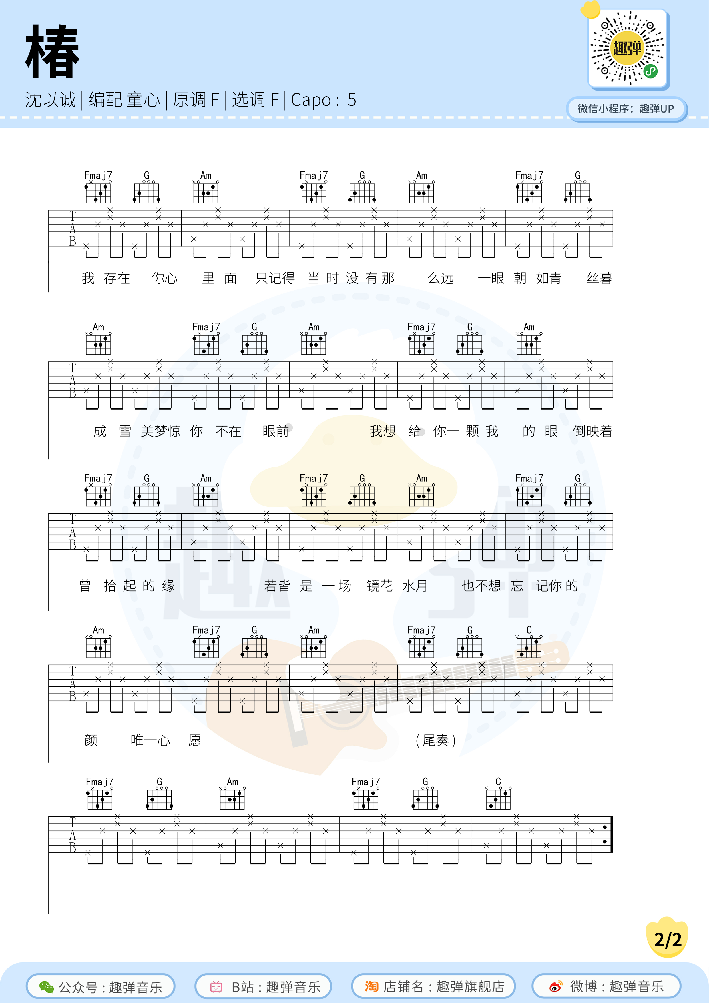 椿吉他谱 - 沈以诚 - F调吉他弹唱谱