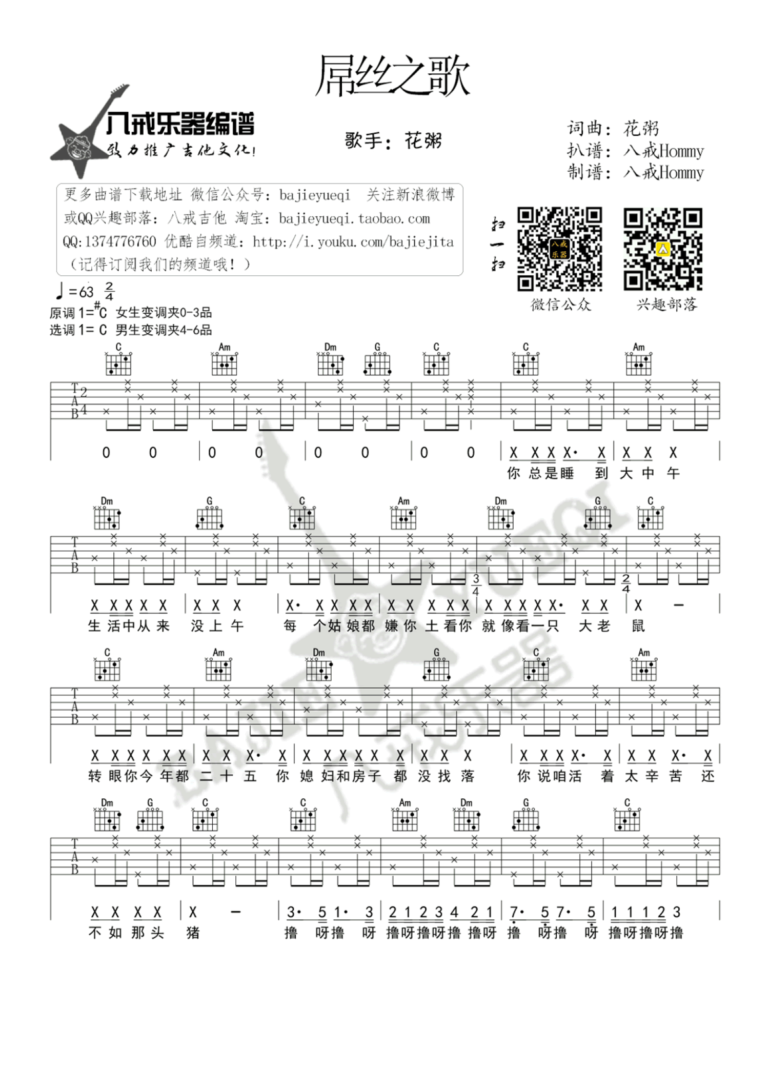 屌丝之歌吉他谱 - 花粥 - C调吉他弹唱谱