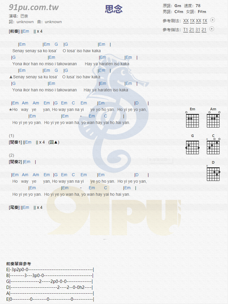 曲谱介绍: 巴奈《思念》吉他弹唱谱,采用G调指法编配,共有1张高清图谱,免翻页排版设计。