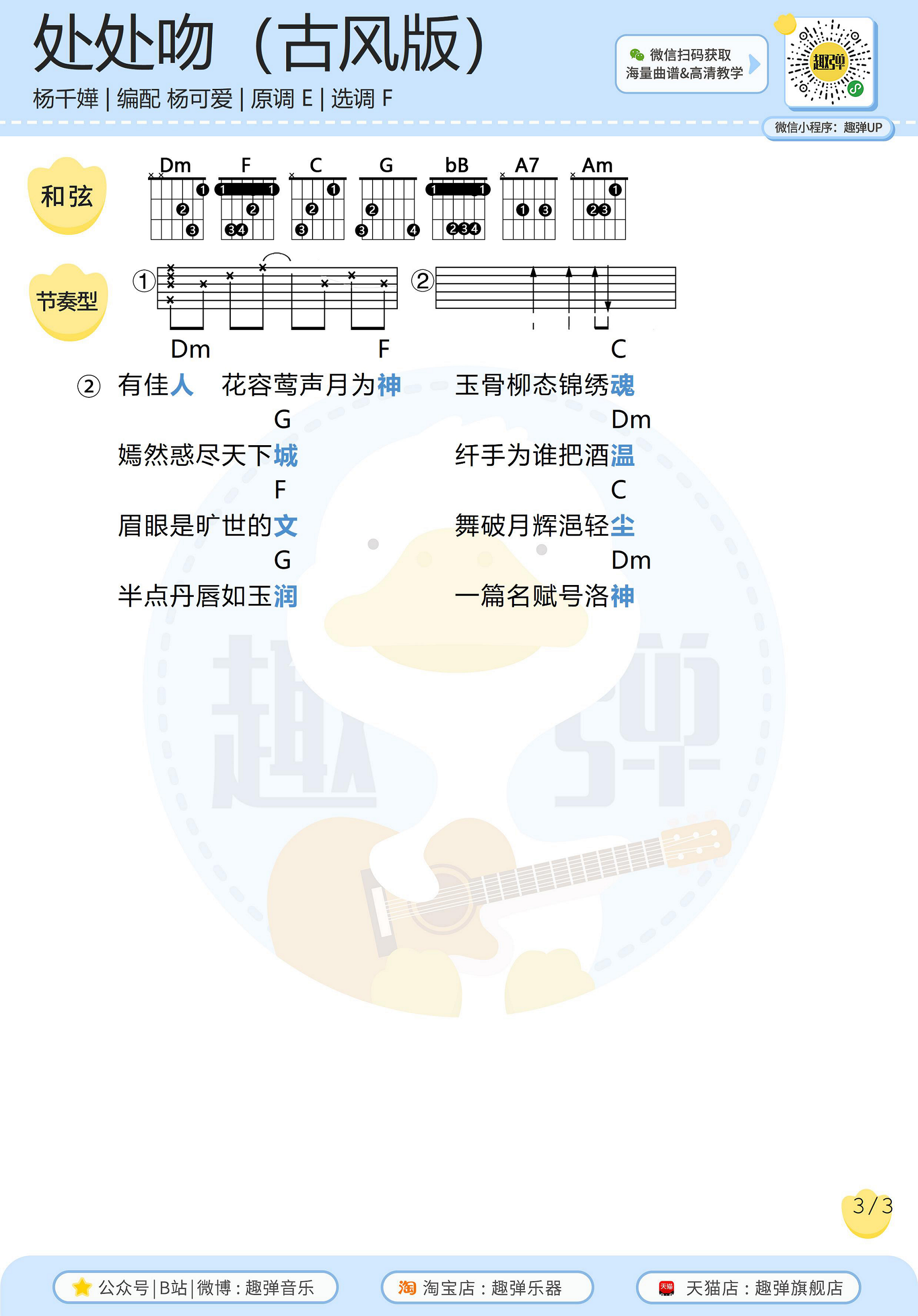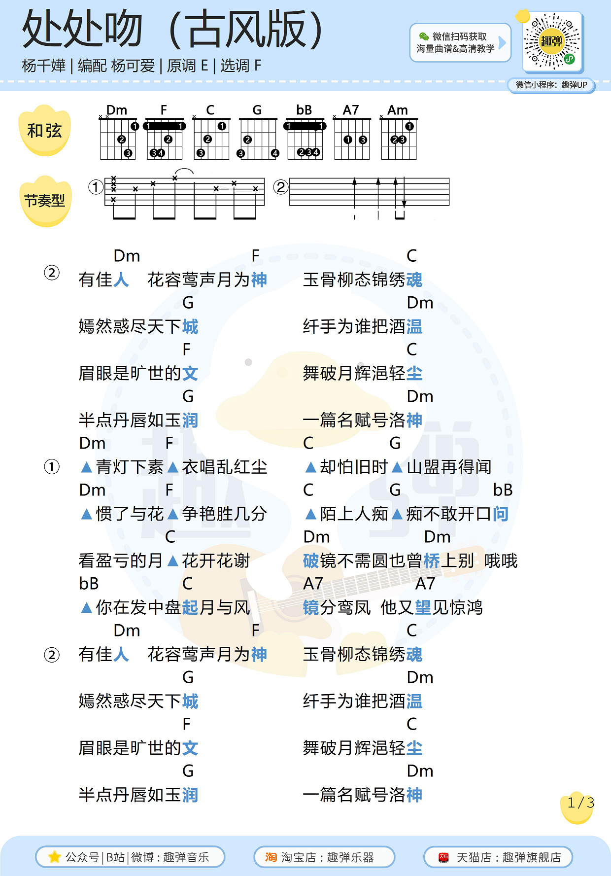 曲谱介绍: 此为杨千嬅《处处吻》古风填词版,原曲由林夕作词,雷颂德作曲,杨千嬅演唱,翻唱杨可爱,古风填词樊宸。 原调E调,选调F调,编配来自趣弹吉他。