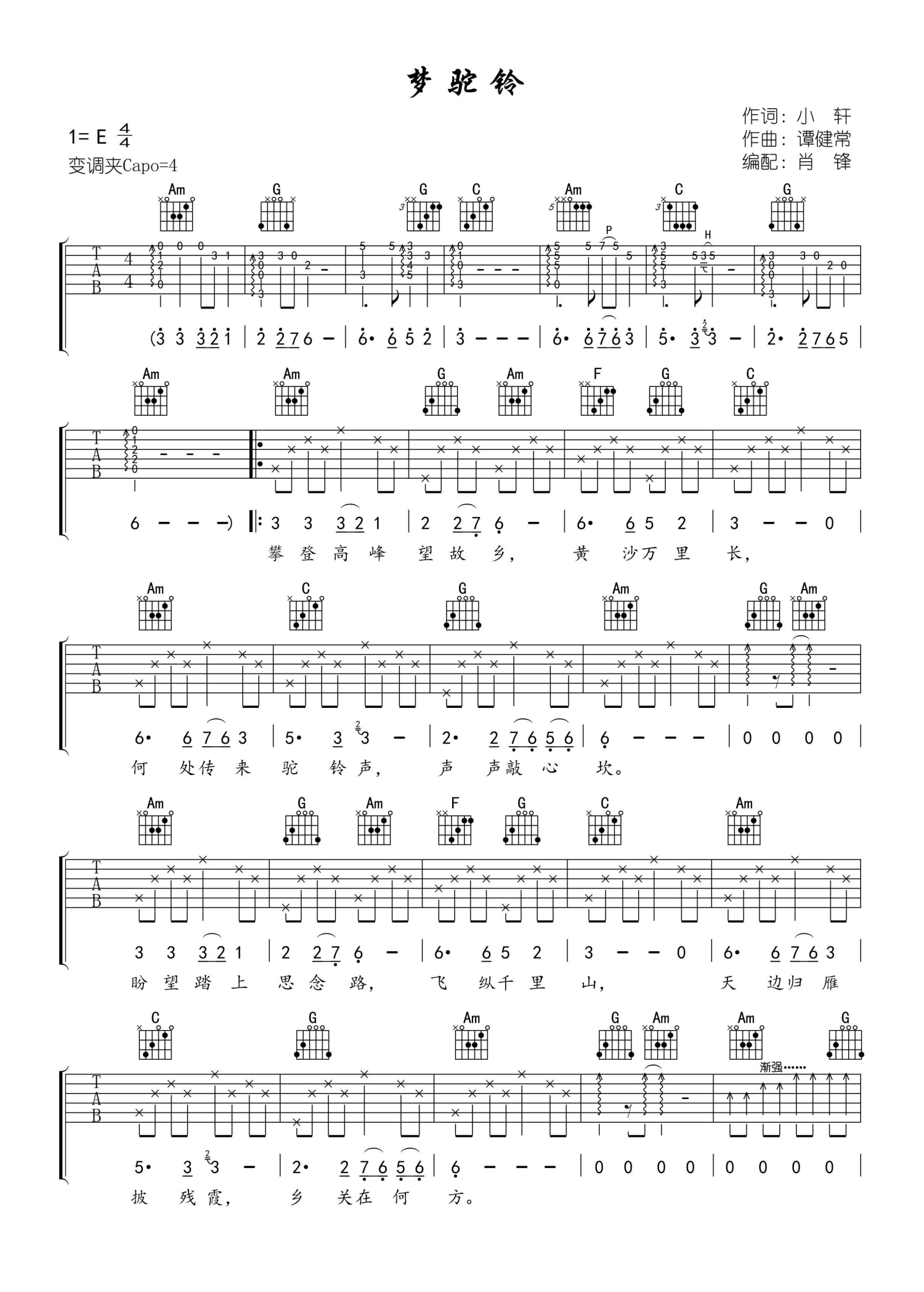 曲谱介绍: 费玉清《梦驼铃》吉他谱_E调吉他弹唱谱