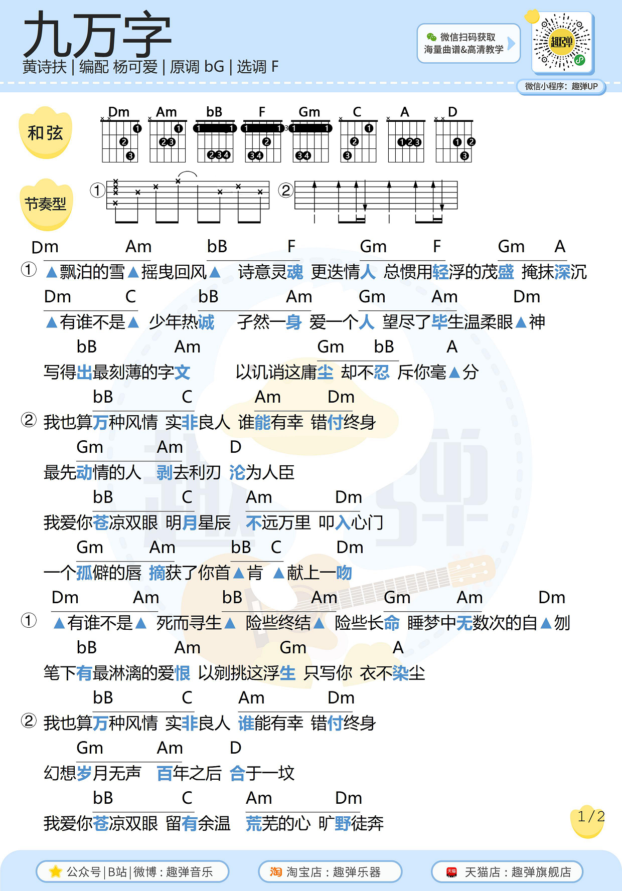 曲谱介绍: “我也算万种风情 实非良人 谁能有幸 错付终身” 《九万字》是左木修作词,WH宇恒、黄诗扶共同作曲,黄诗扶演唱的古风歌。 原调bG,选调F调,编配来自趣弹吉他。