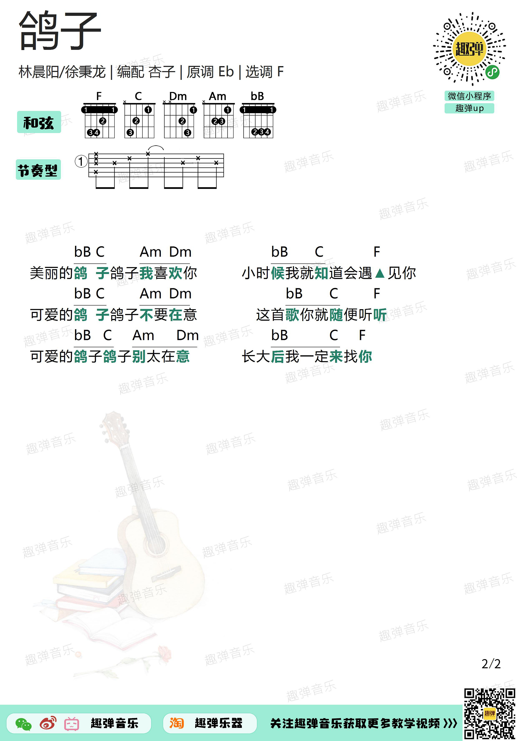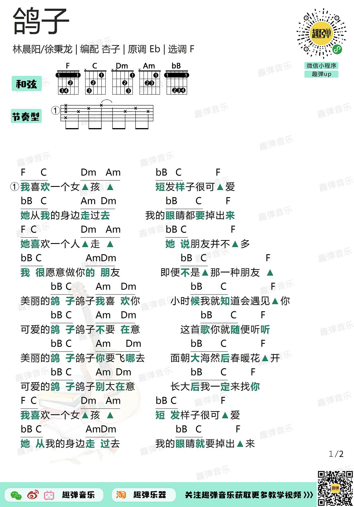 曲谱介绍: 分享林晨阳和徐秉龙的《鸽子》,原调bE调,选调F调,编配来自趣弹吉他。