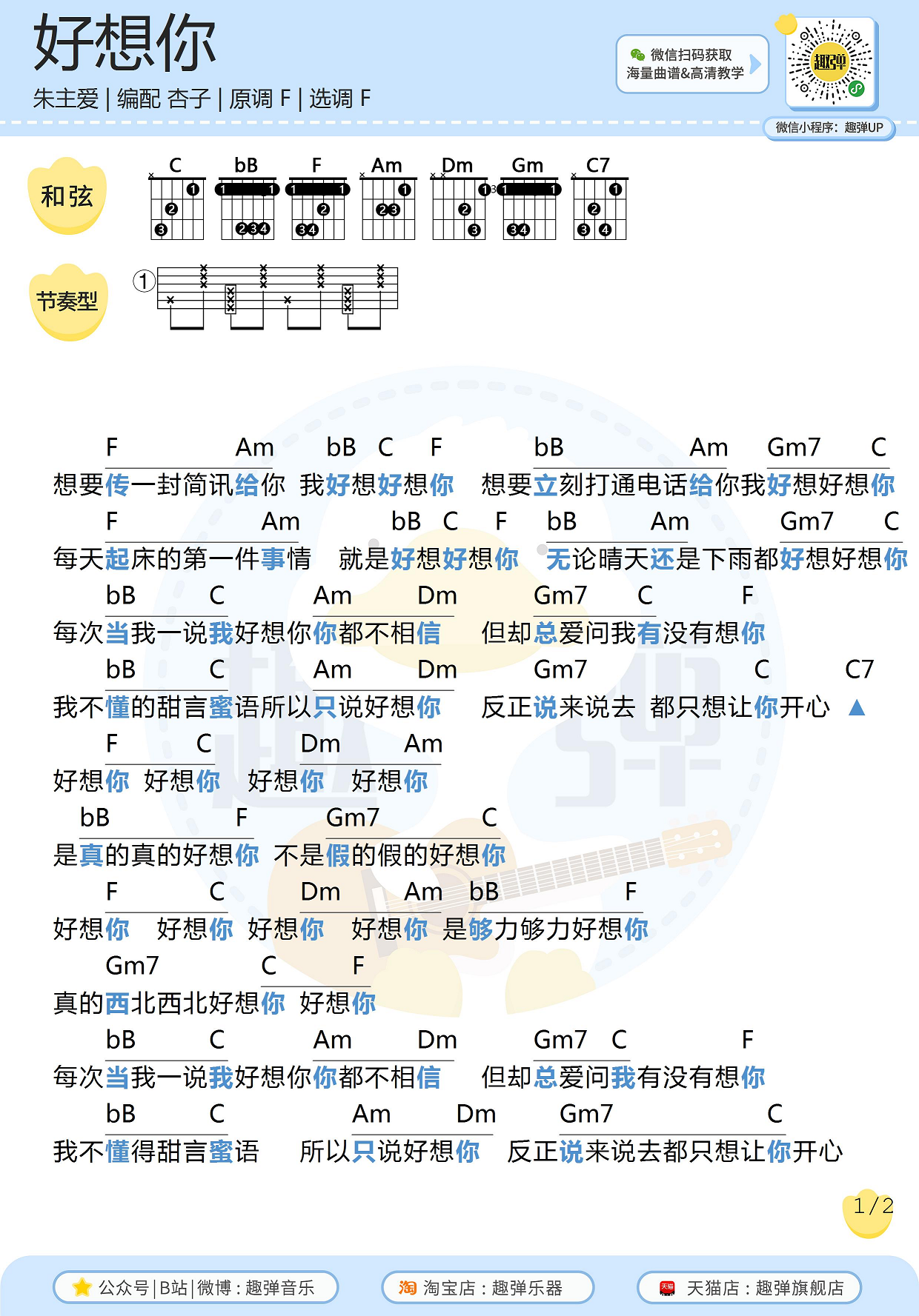 曲谱介绍: “想要传送一封简讯给你 我好想好想你 想要立刻打通电话给你 我好想好想你” 《好想你》这首歌是黄明志特别打造的歌曲,也是朱主爱发行的同名新EP《四叶草Joyce Chu》中的主打歌曲。“好想你”这三个字在整首歌里出现了55次,曲风轻快活泼,妥妥的告白神曲没错了。 原调F调,选调F调,编配来自趣弹吉他。