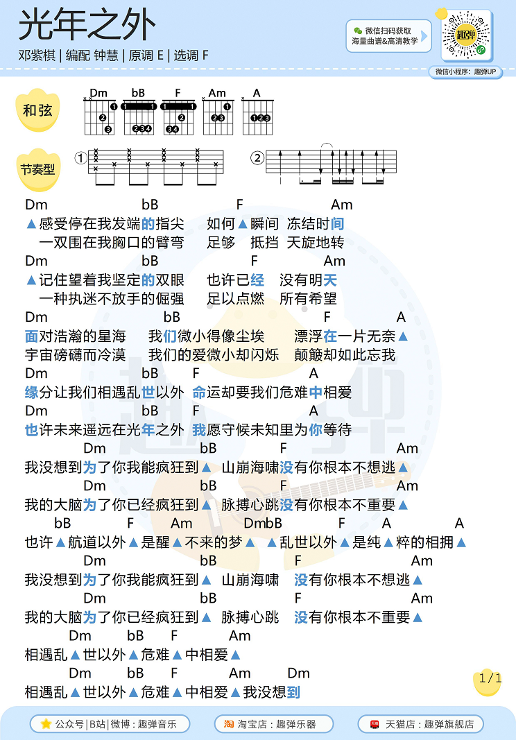 曲谱介绍: “缘分让我们相遇乱世以外 命运却要我们危难中相爱” 《光年之外》是电影《太空旅客》中国区主题曲、片尾曲,由邓紫棋作词、作曲并演唱的歌曲。2018年,邓紫棋受邀出席在美国硅谷NASA举办、有“科学界奥斯卡”之称的第七届科学“突破奖”颁奖礼,现场演唱《光年之外》。 原调E调,选调F调,编配来自趣弹吉他。