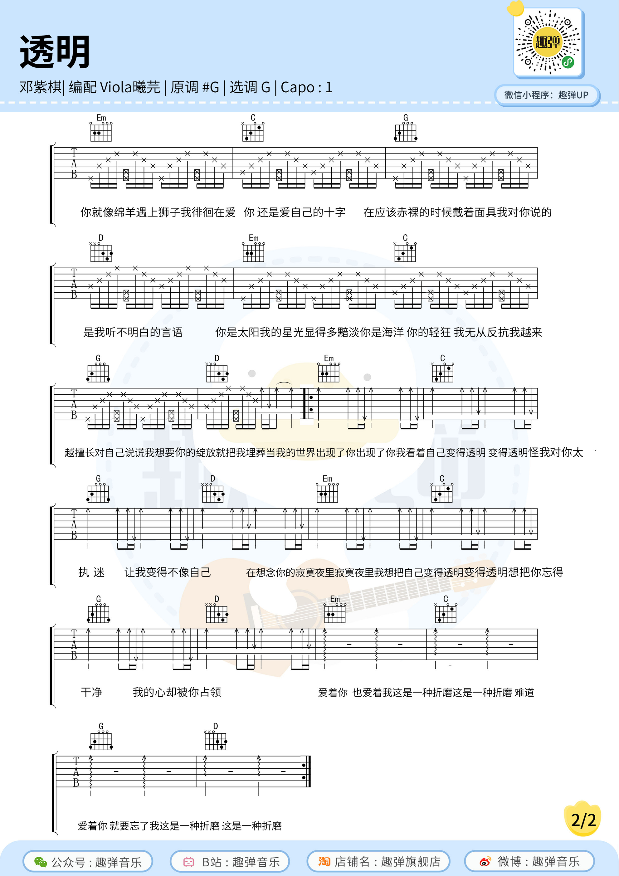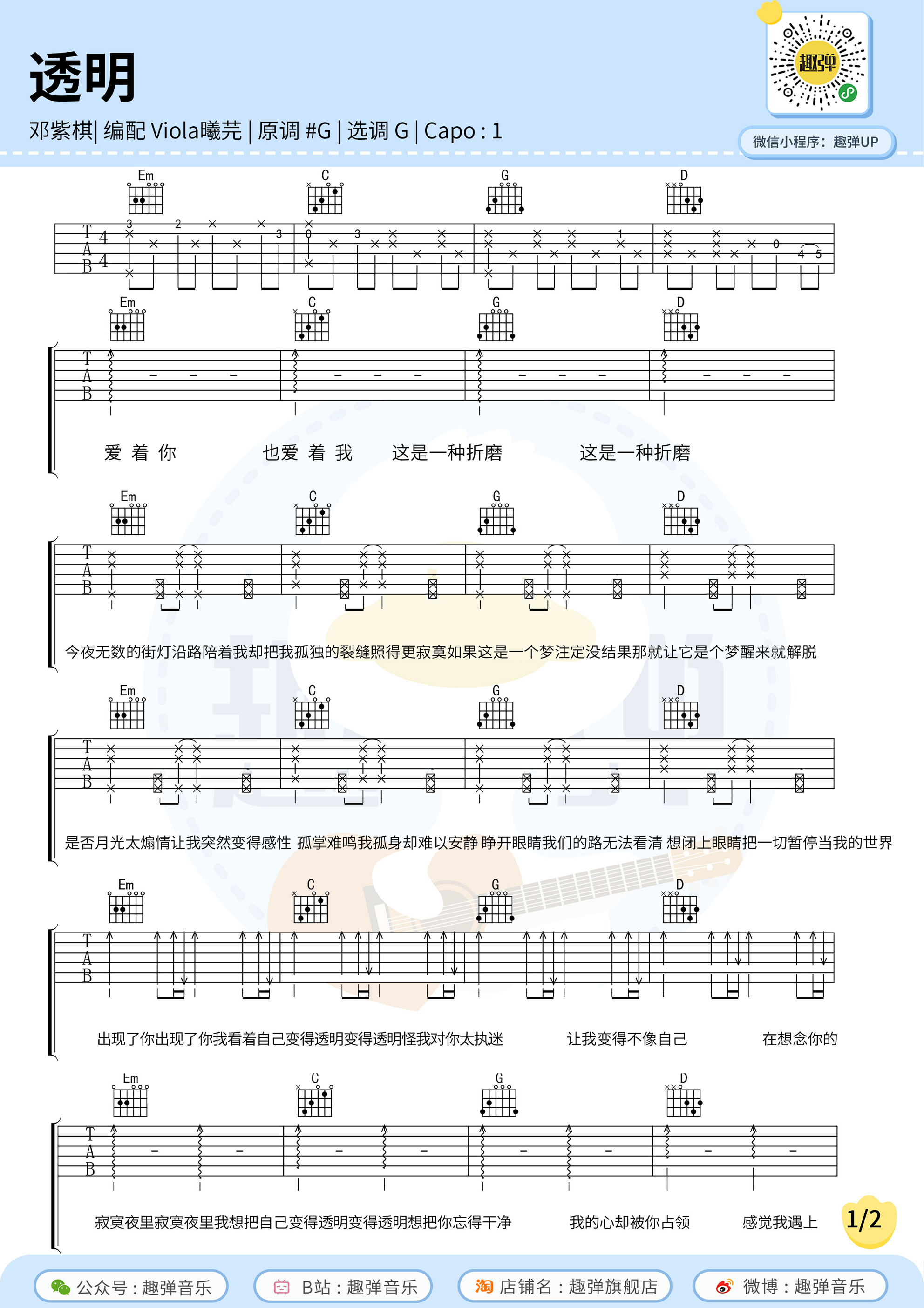 曲谱介绍: "《透明》是由邓紫棋作词、作曲并演唱的一首歌曲,收录于专辑《摩天动物园》中,发行于2019年12月27日。 原调#G调,选调G调,变调夹夹1品,编配来自趣弹吉他。 教学:http://v.qq.com/x/page/b3060264aes.html"