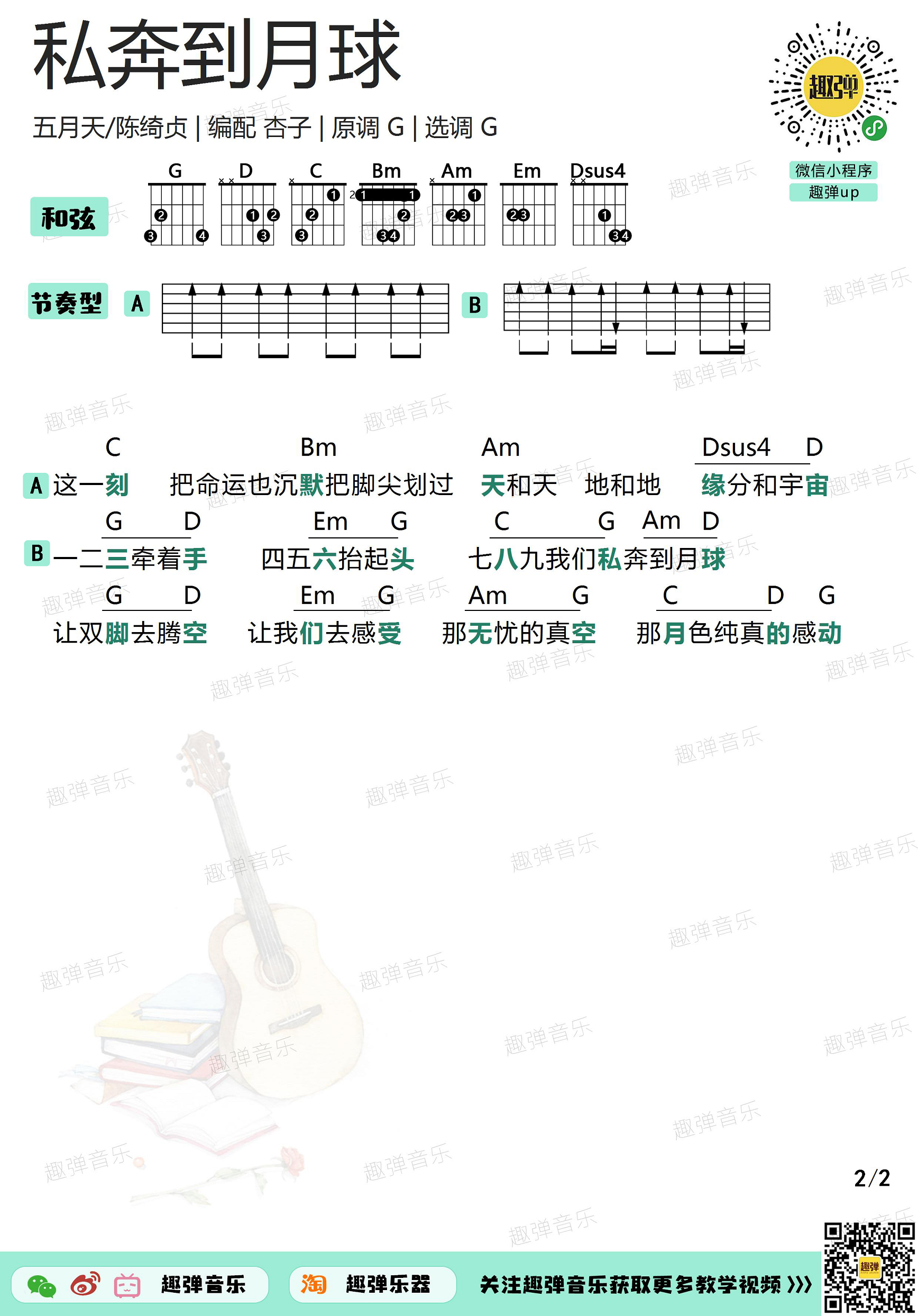 曲谱介绍: "“私奔”这个词带着叛逆、浪漫的感觉,五月天创作的这首《私奔到月球》将这种感觉无限扩大,私奔到逃出地球还不够,还要去到月球! 原调G调,选调G调,编配来自趣弹吉他。"