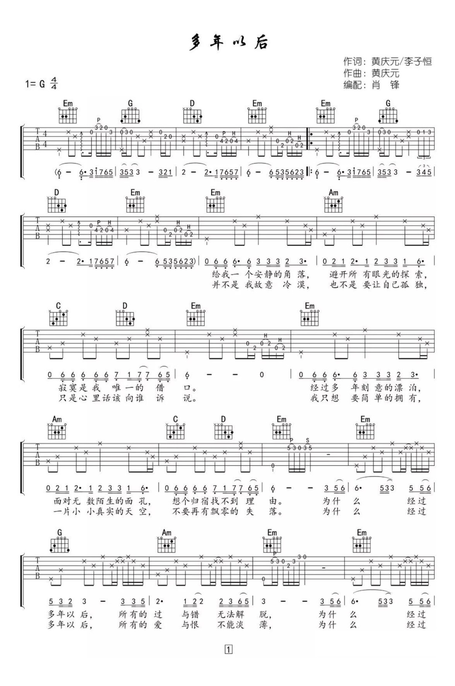 曲谱介绍: 姜育恒《多年以后》吉他谱_G调吉他弹唱谱