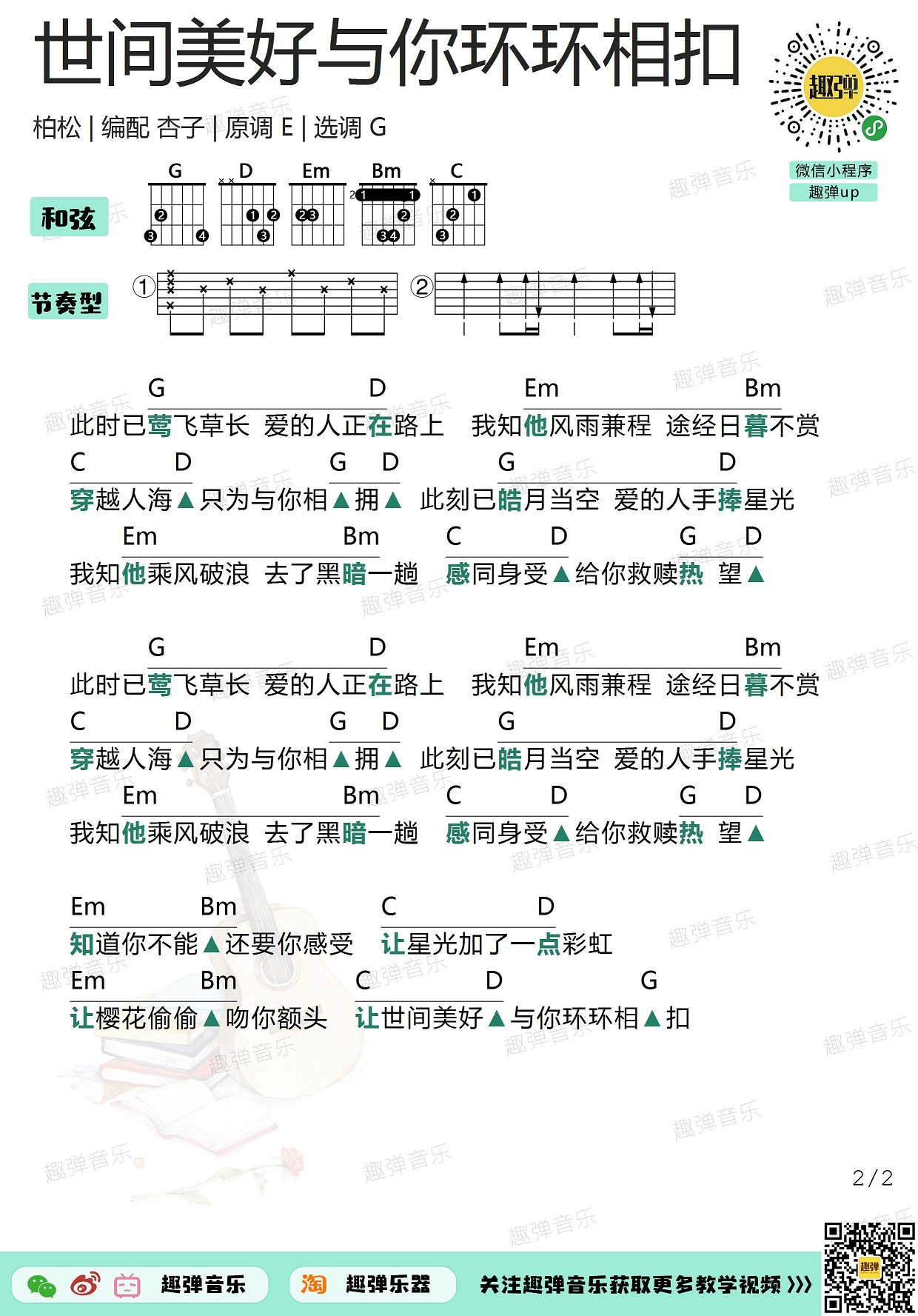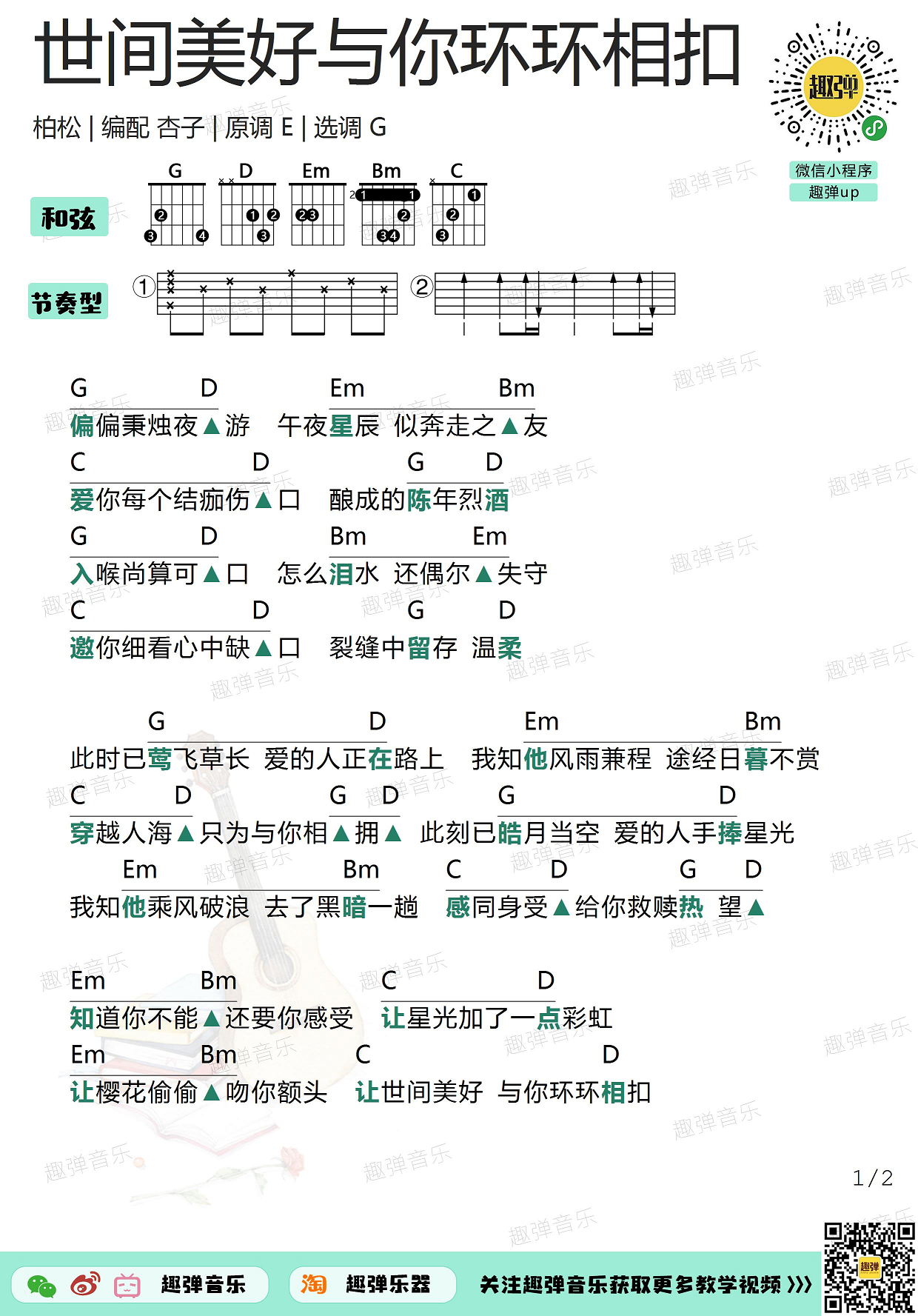曲谱介绍: 2019年超火爆的治愈系歌曲《世间美好与你环环相扣》,原道E调,选调G调,编配来自趣弹吉他。