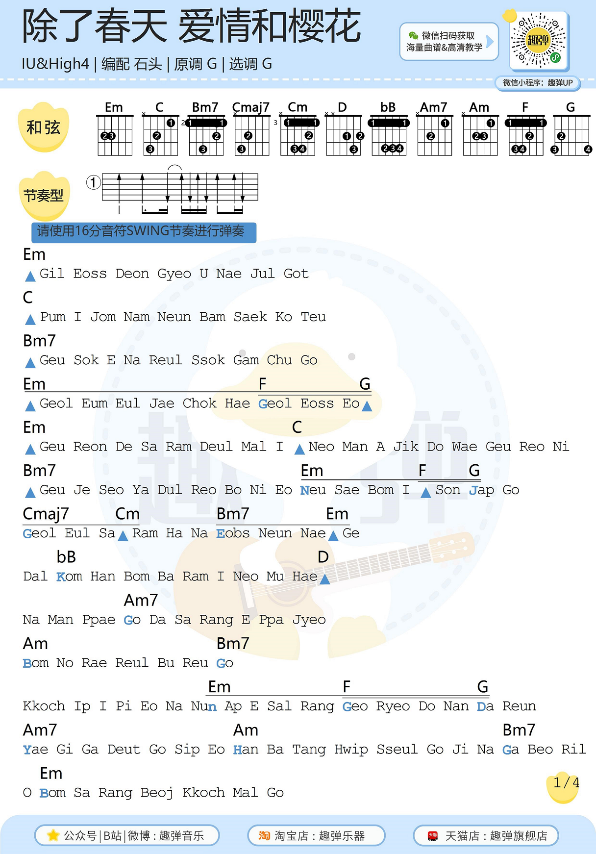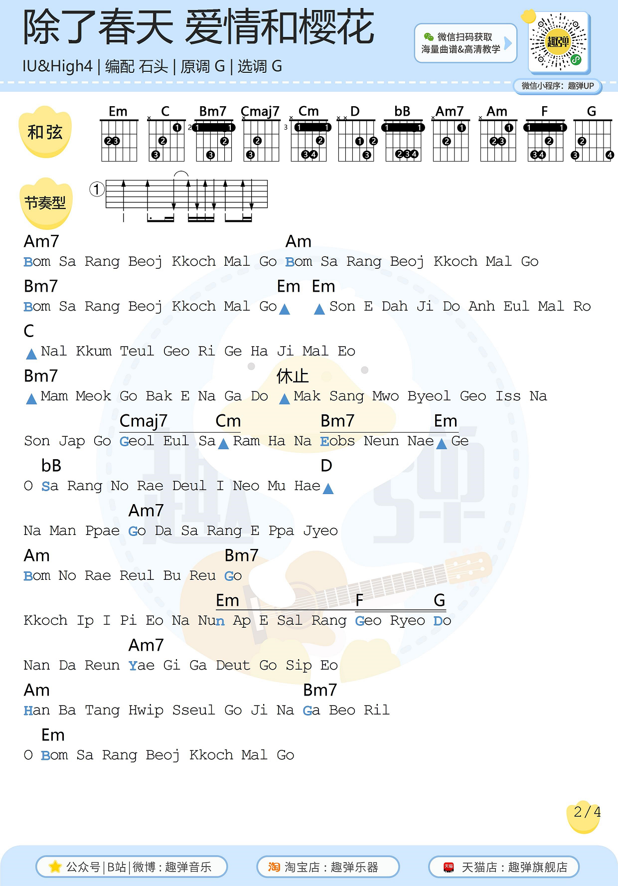 曲谱介绍: IU,High4《除了春天爱情和樱花》吉他弹唱谱,采用G调指法编配,共有4张高清图谱。