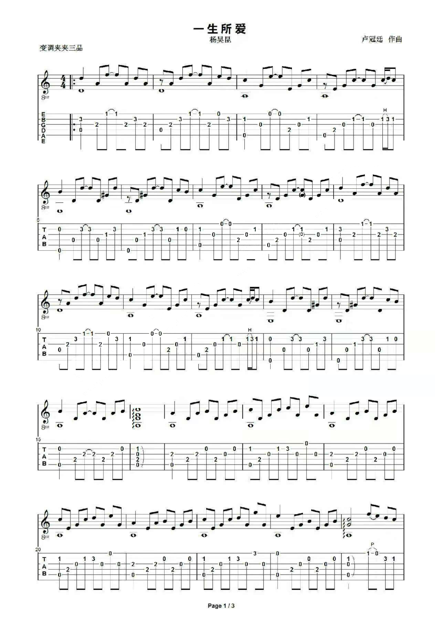 曲谱介绍: 卢冠廷《一生所爱》吉他谱_吉他独奏谱_杨昊昆版本