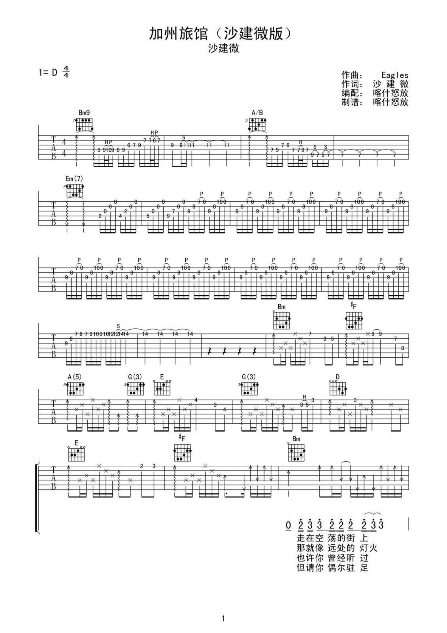 曲谱介绍: 沙建微《加州旅馆》吉他谱_D调吉他弹唱谱