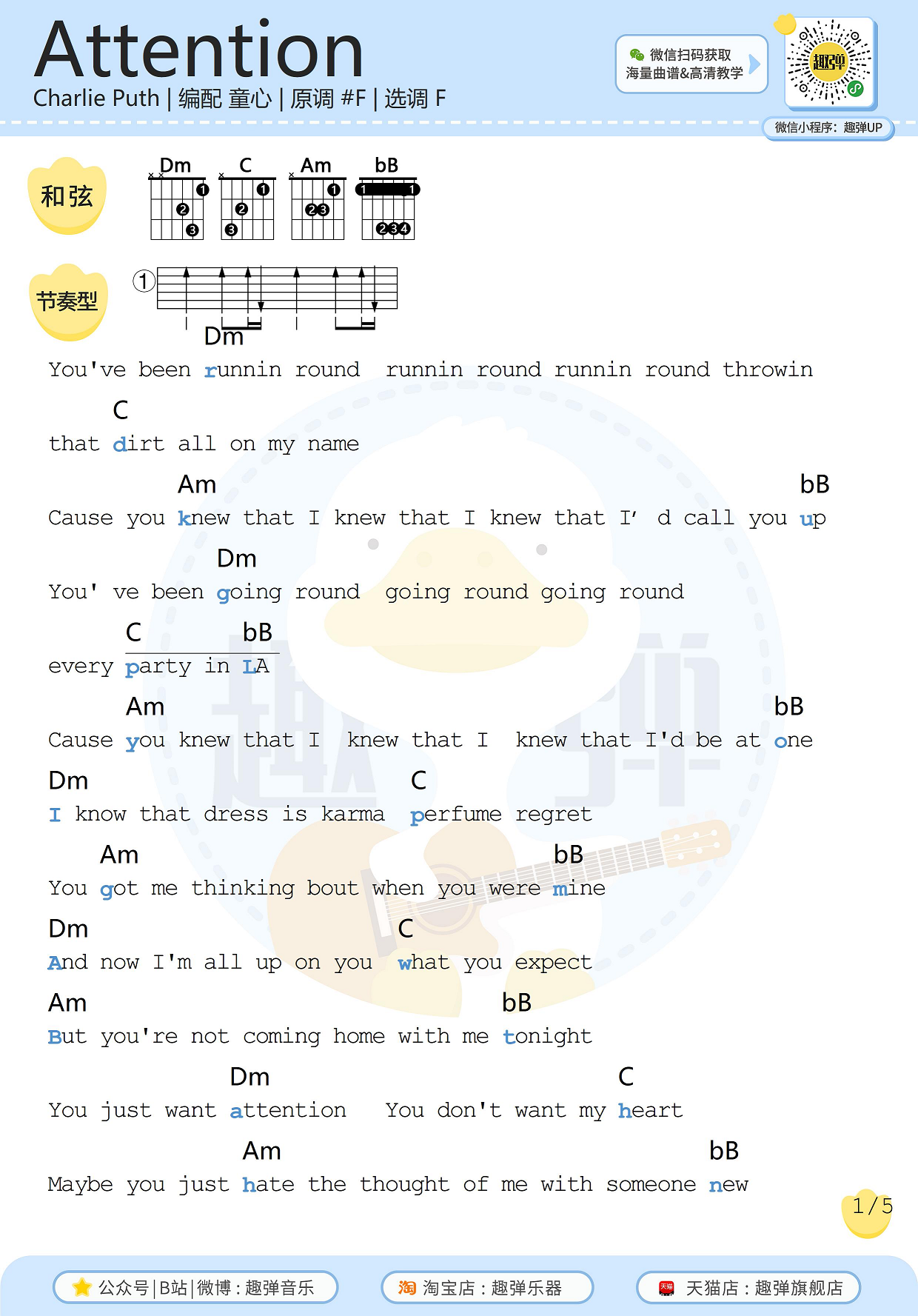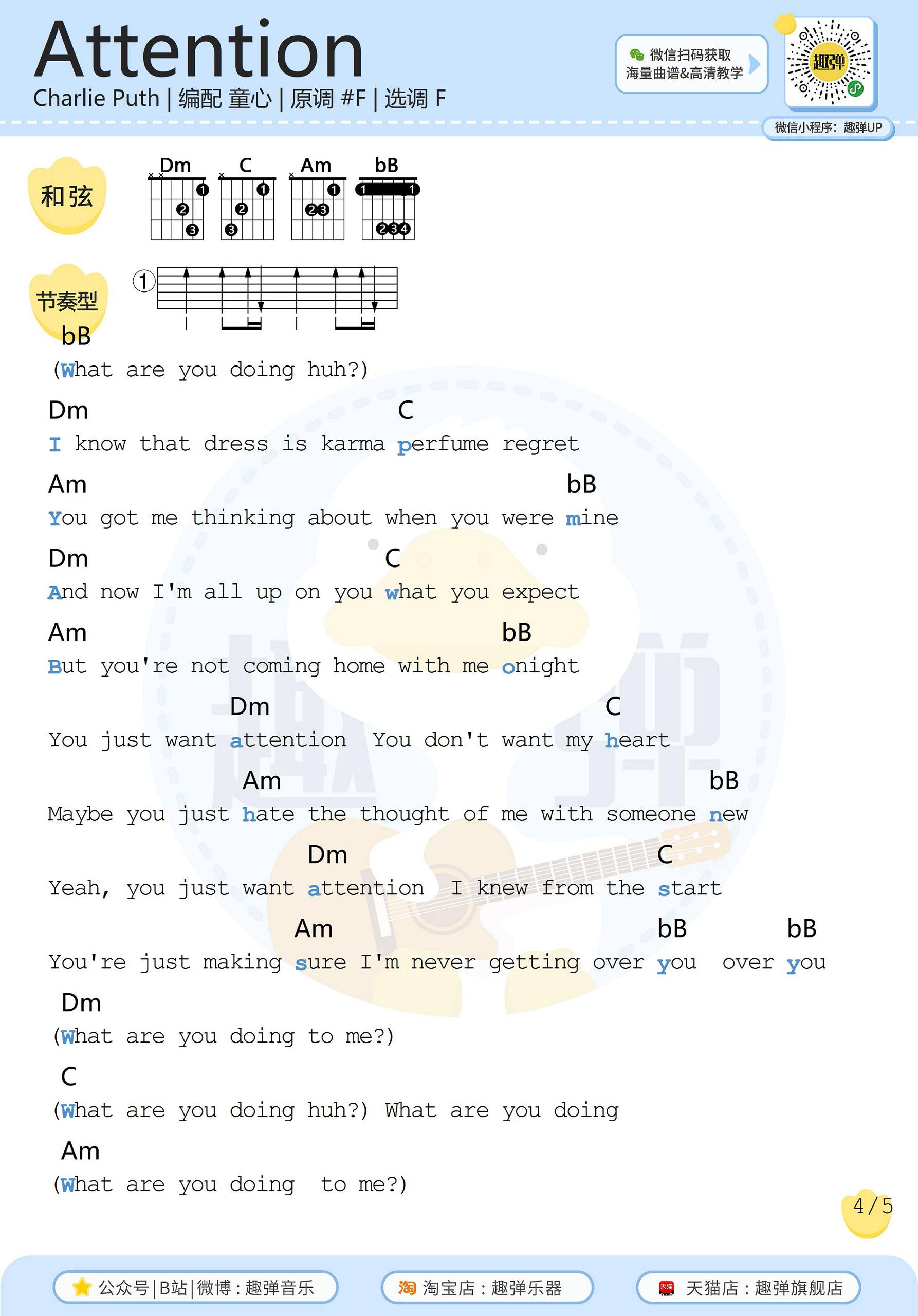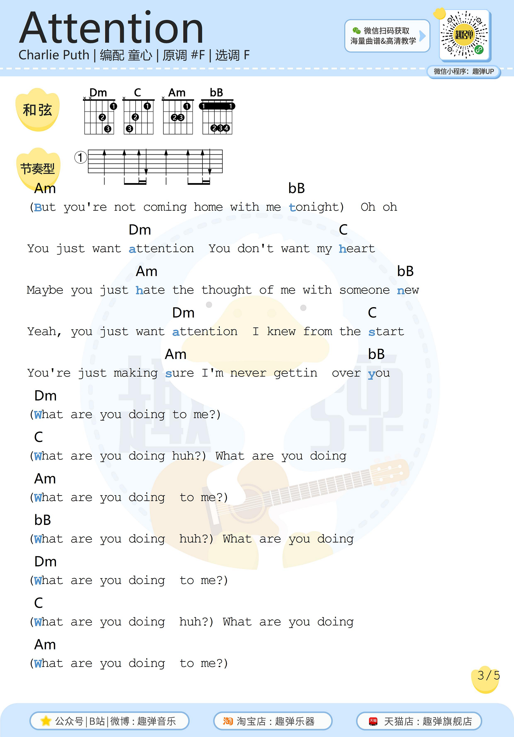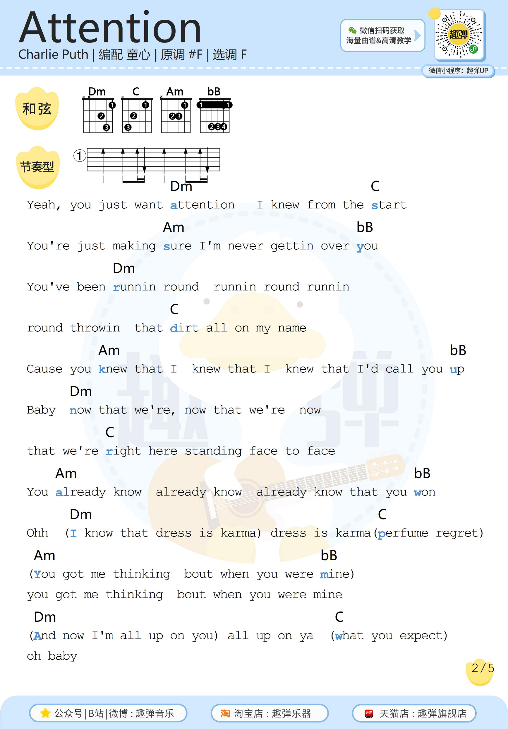 曲谱介绍: Chrlie,Puth《Attention》吉他弹唱谱,采用F调指法编配,共有5张高清图谱。
