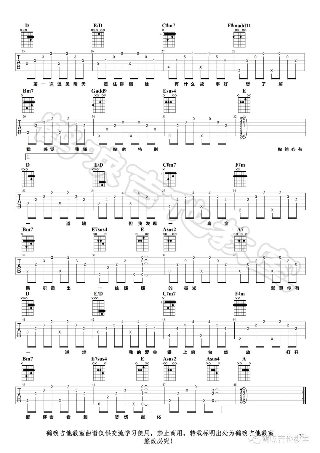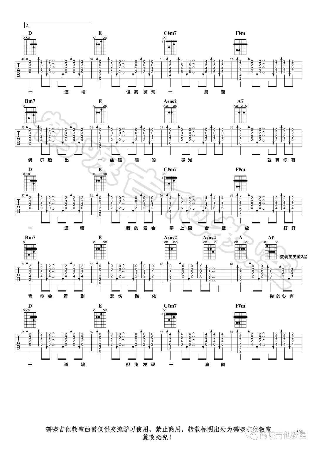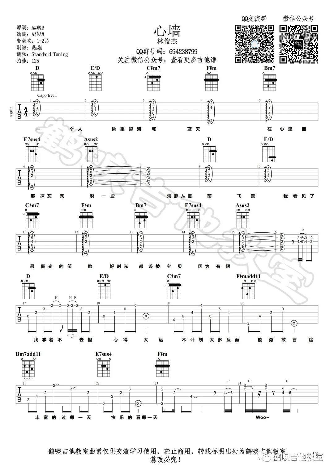 曲谱介绍: 林俊杰《心墙》吉他弹唱谱,采用A调指法编配,共有10张高清图谱。