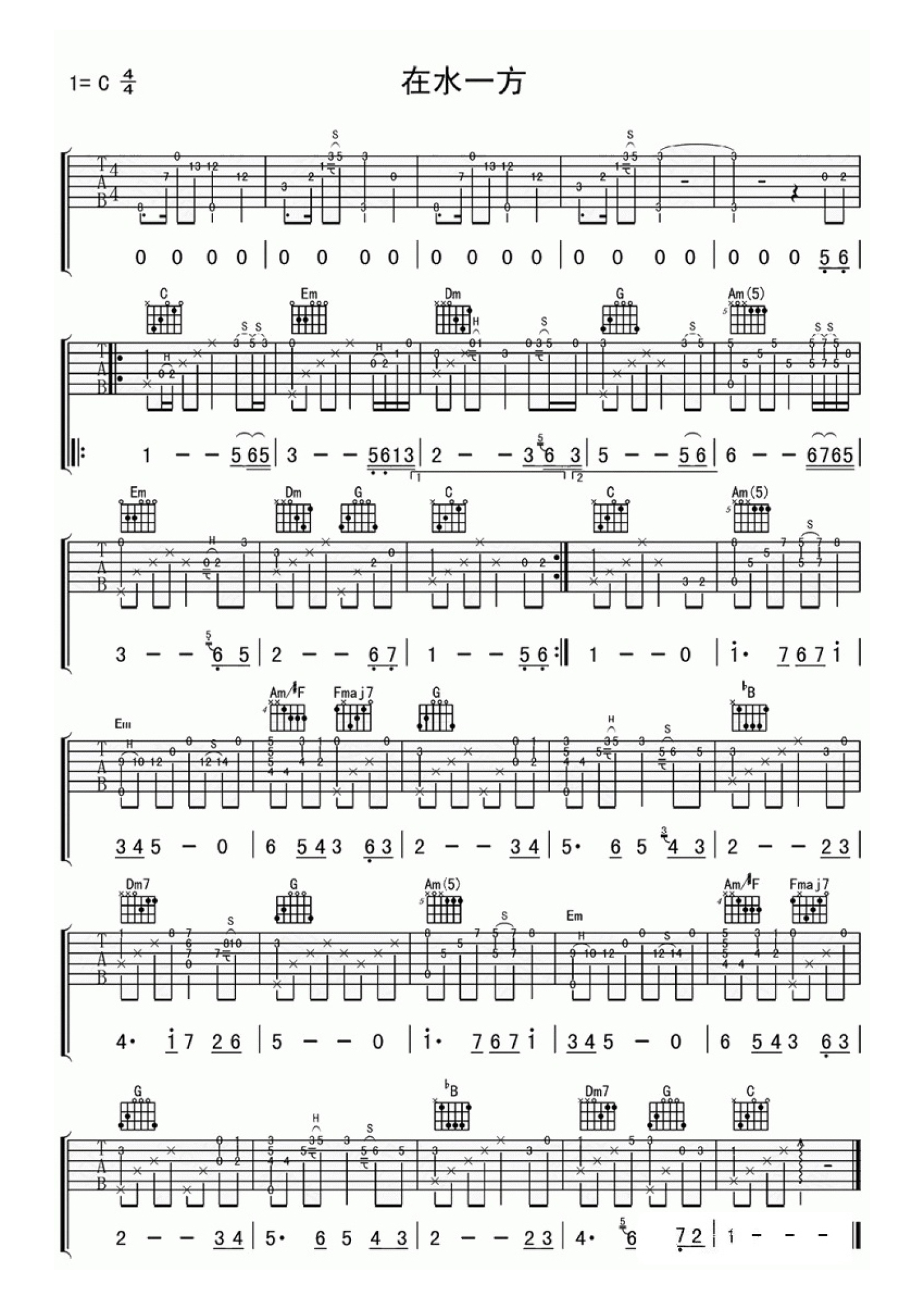 曲谱介绍: 邓丽君《在水一方》吉他谱_C调吉他独奏谱