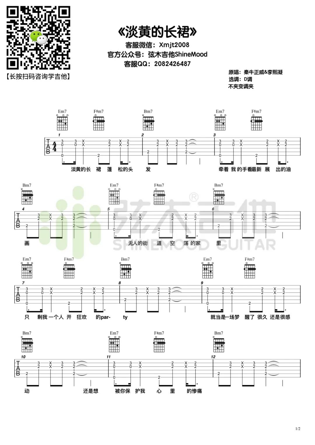 曲谱介绍: 秦牛正威,李熙凝《淡黄的长裙》吉他弹唱谱,采用D调指法编配,共有2张高清图谱,免翻页排版设计。