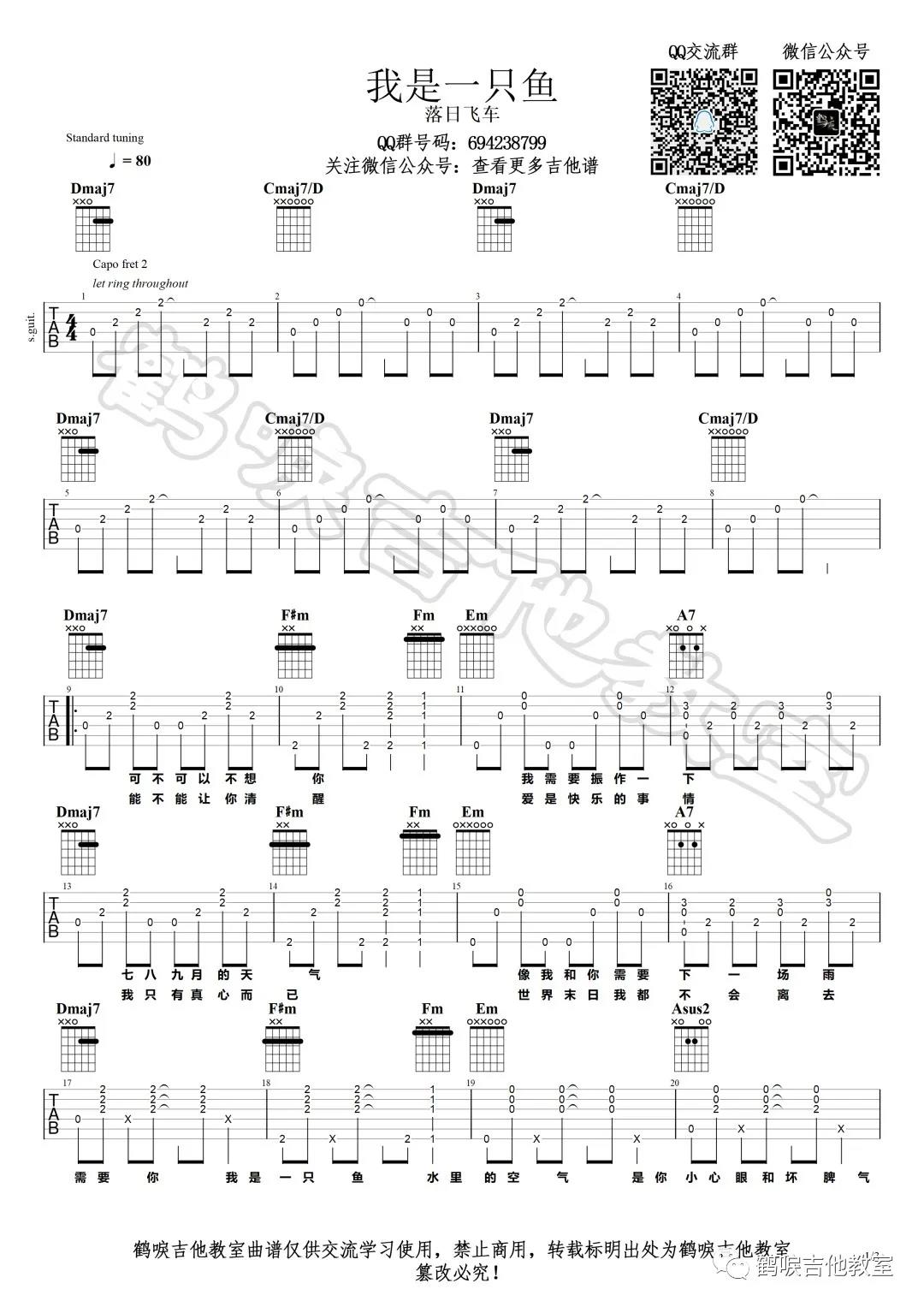 曲谱介绍: 落日飞车《我是一只鱼》吉他弹唱谱,采用D调指法编配,共有3张高清图谱。