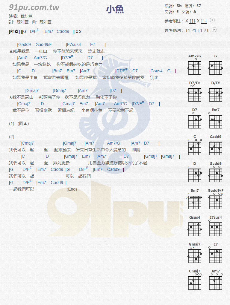 曲谱介绍: 魏如萱《小鱼》吉他弹唱谱,采用B调指法编配,共有1张高清图谱,免翻页排版设计。