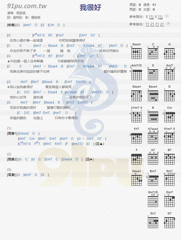 曲谱介绍: 梁咏琪《我很好》吉他弹唱谱,采用G调指法编配,共有1张高清图谱,免翻页排版设计。