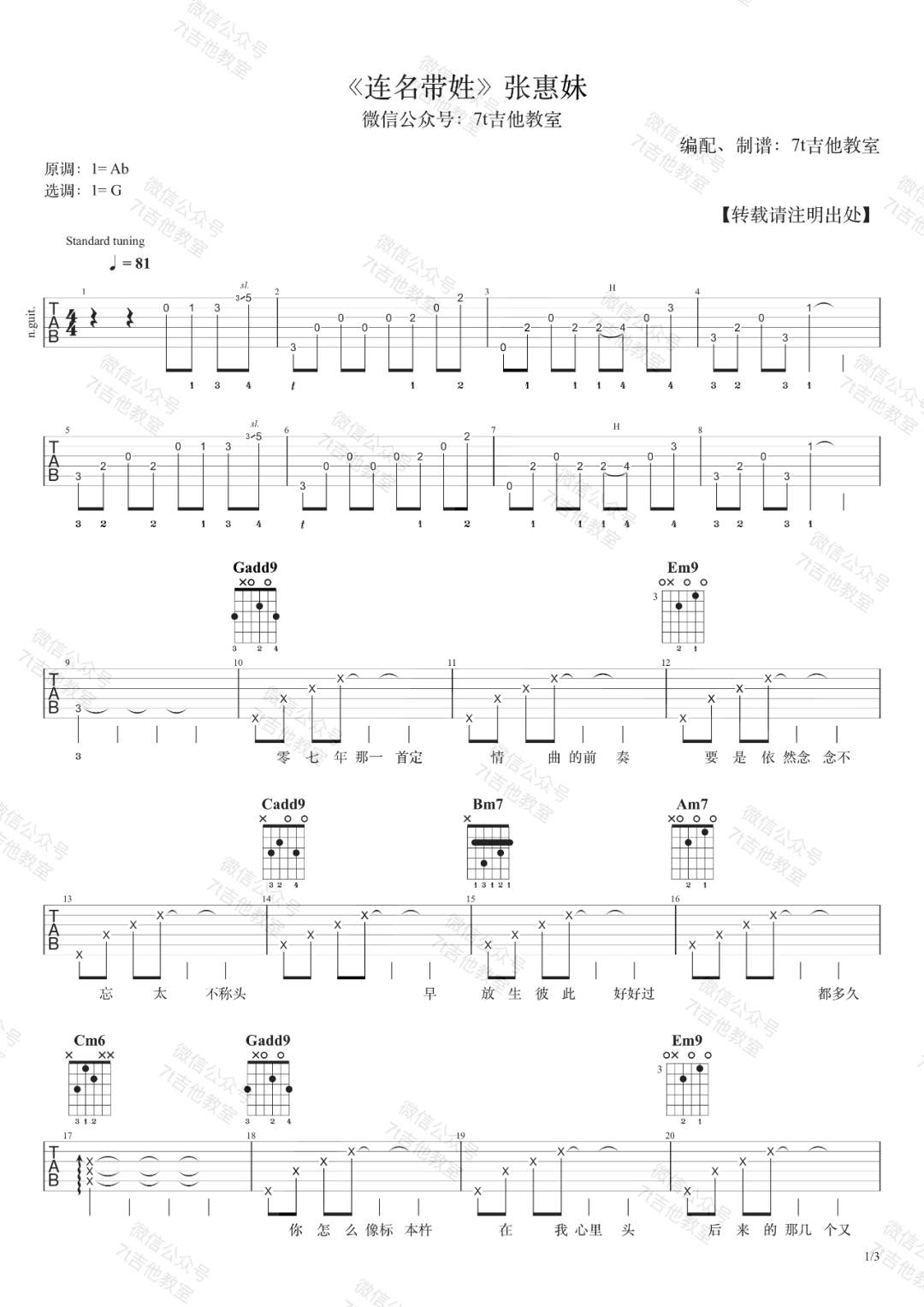 曲谱介绍: 张惠妹《连名带姓》吉他弹唱谱,采用G调指法编配,共有3张高清图谱。