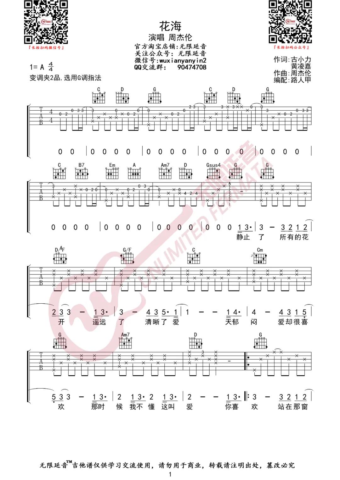 曲谱介绍: 周杰伦《花海》吉他弹唱谱,采用A调指法编配,共有3张高清图谱。