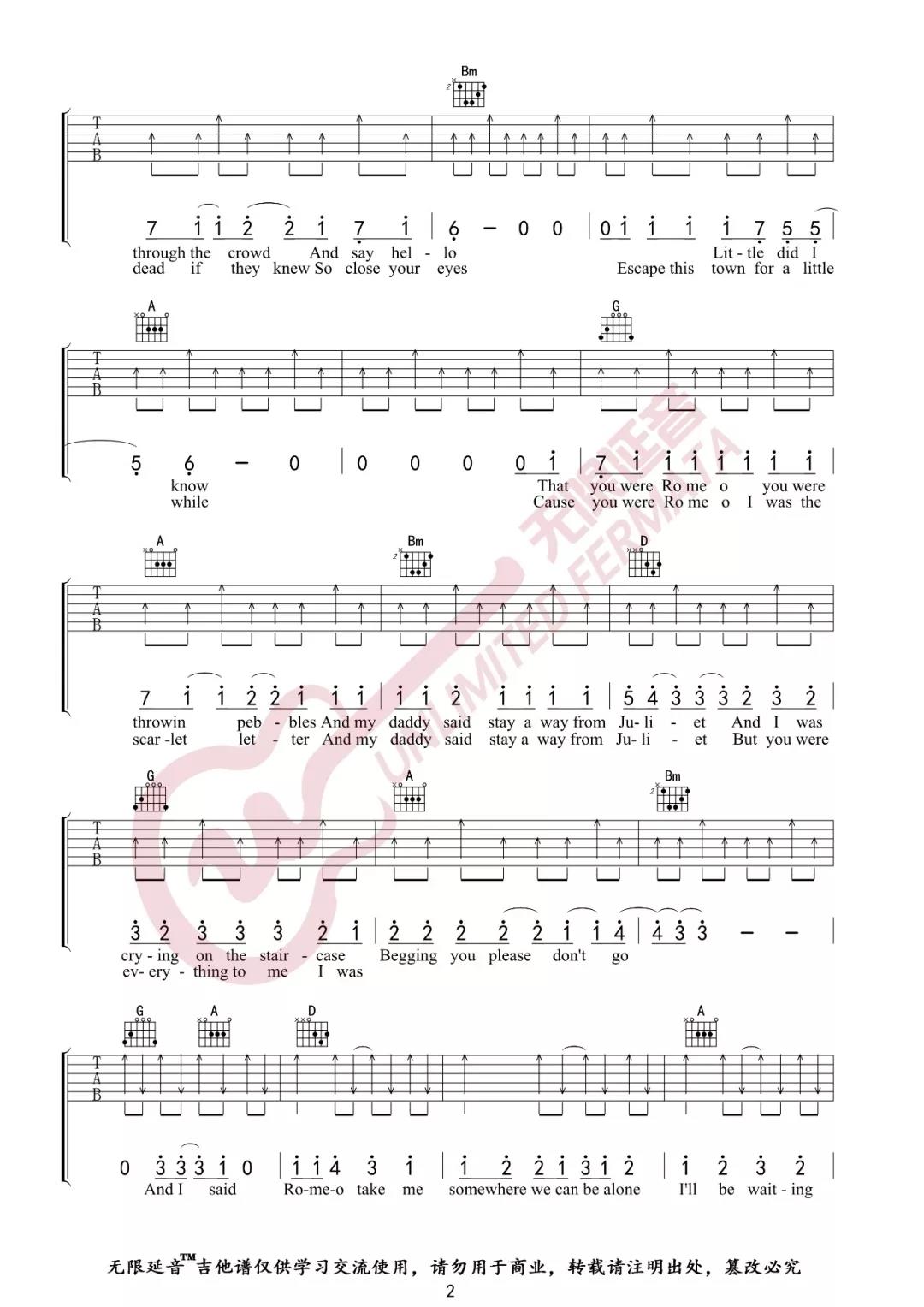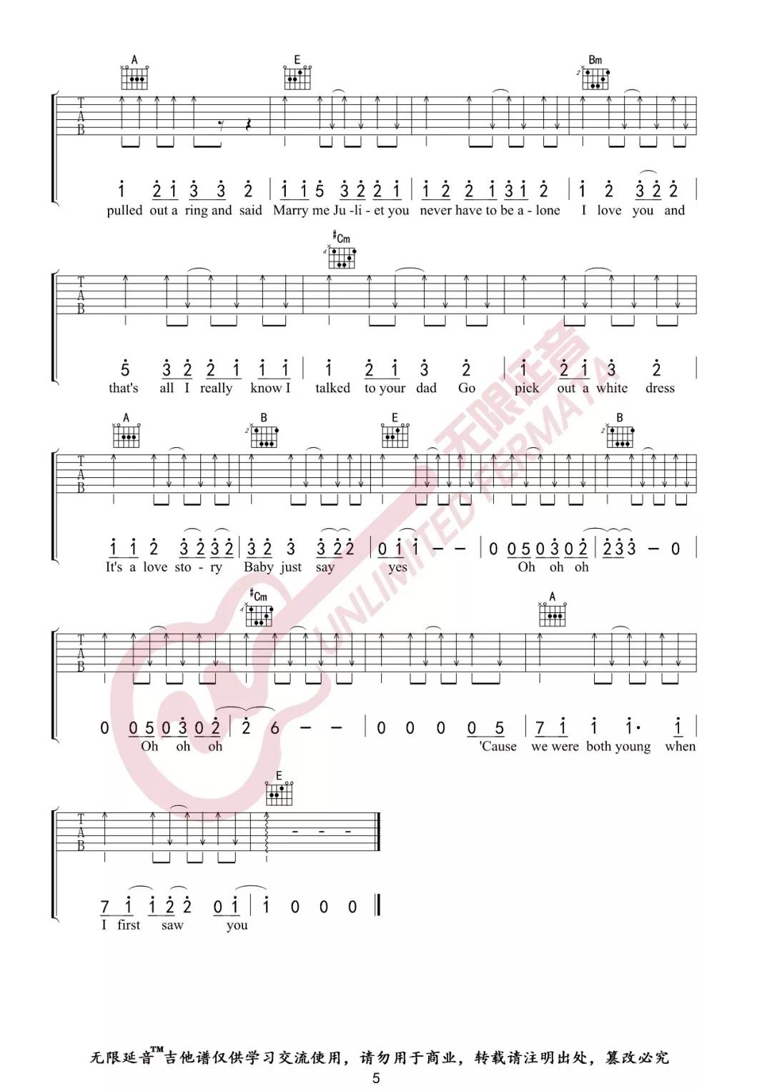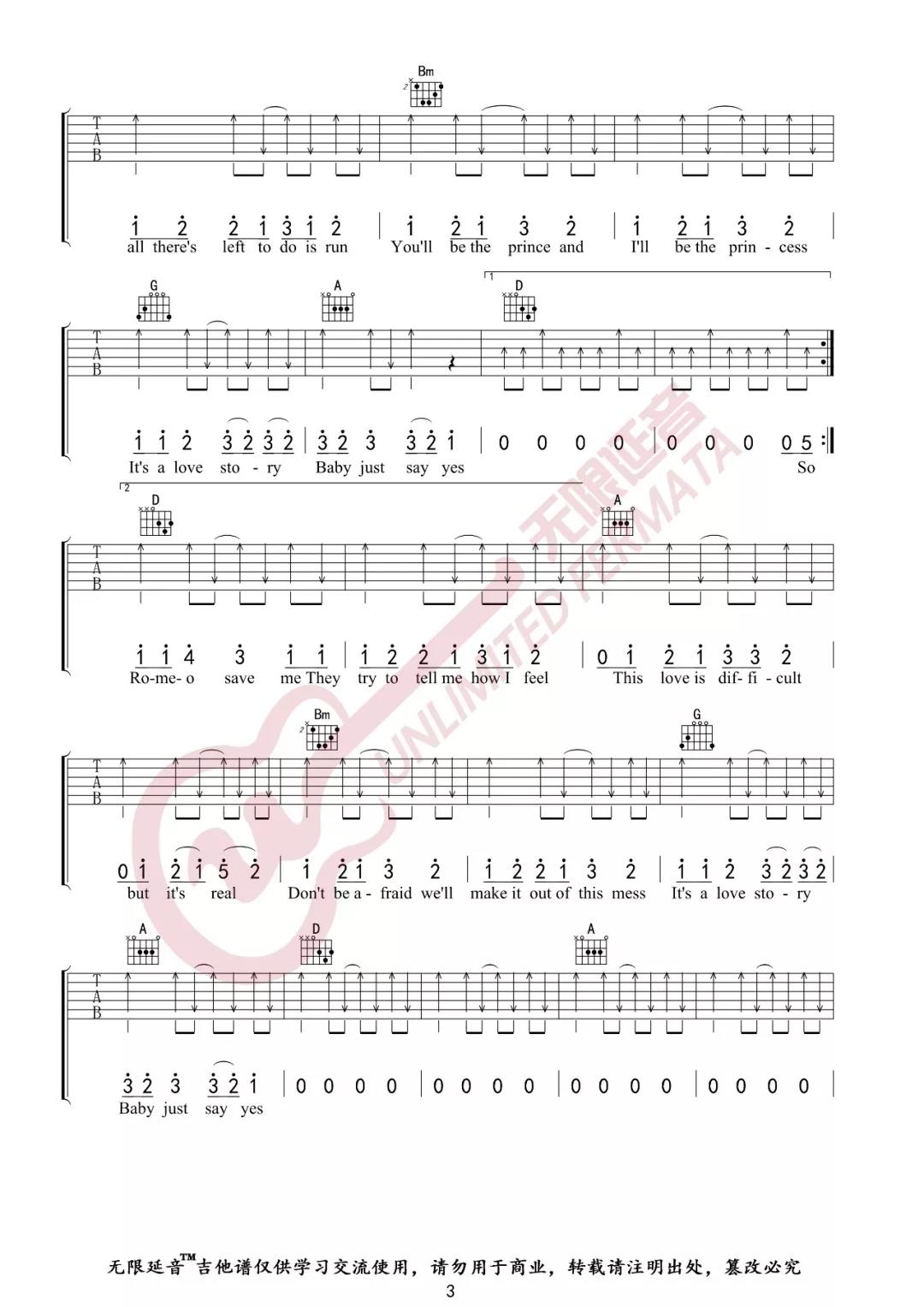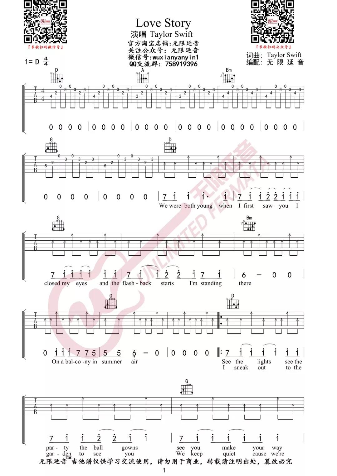 曲谱介绍: Taylor,Swift《LoveStory》吉他弹唱谱,采用D调指法编配,共有5张高清图谱。