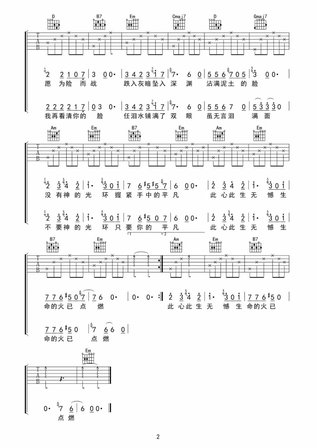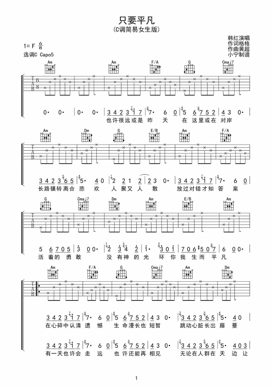 曲谱介绍: 韩红《只要平凡》吉他弹唱谱,采用F调指法编配,共有4张高清图谱。