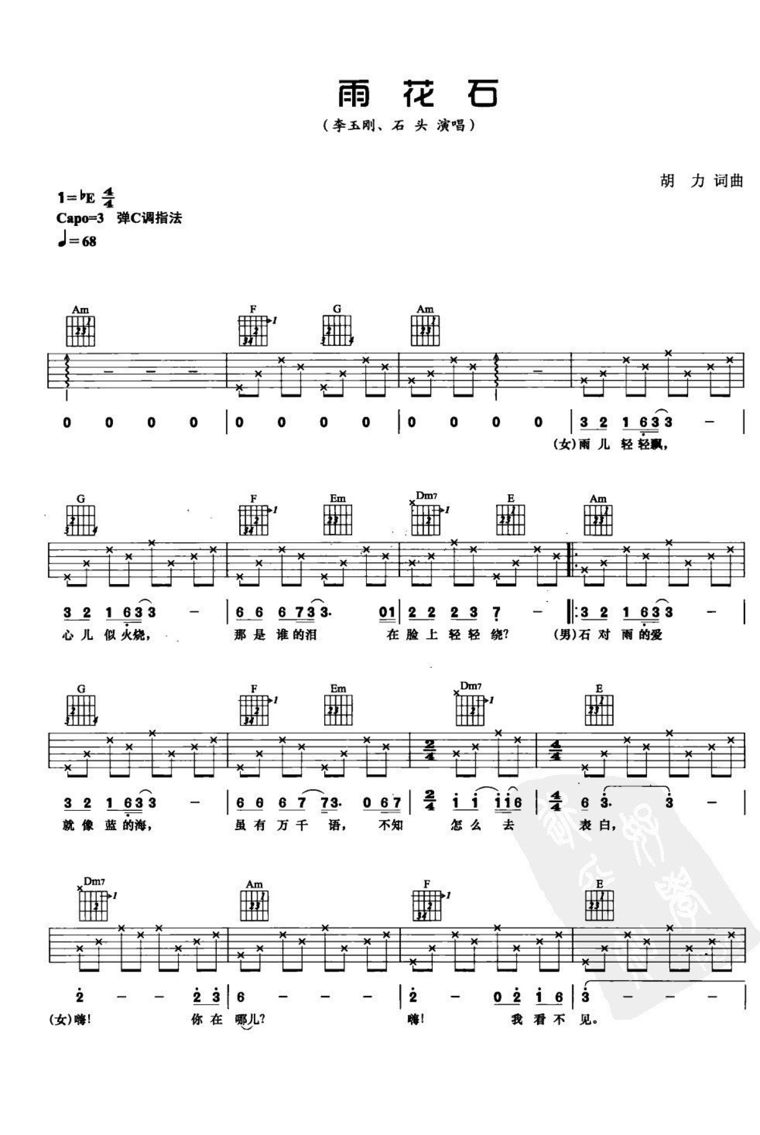 曲谱介绍: 李玉刚/石头《雨花石》吉他谱_C调吉他弹唱谱