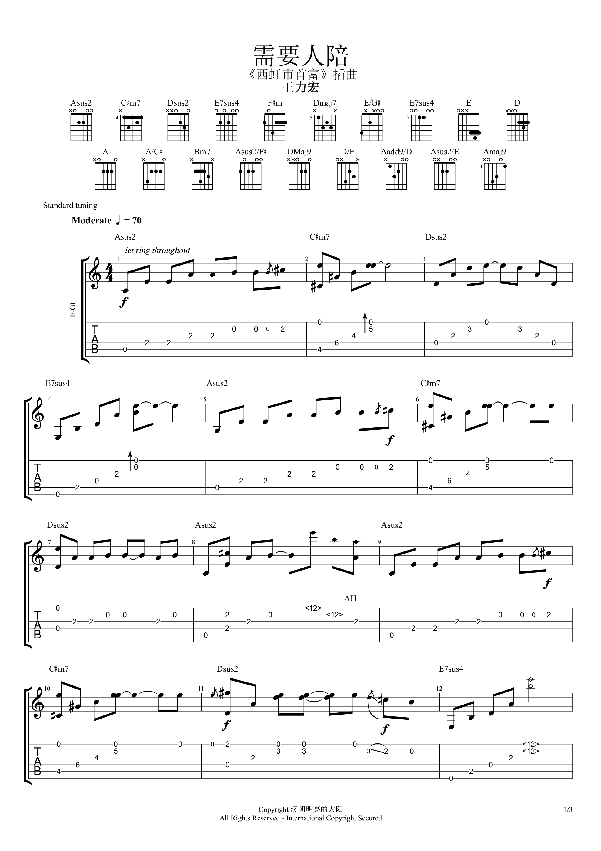 需要人陪吉他谱 - 王力宏 - 吉他独奏谱