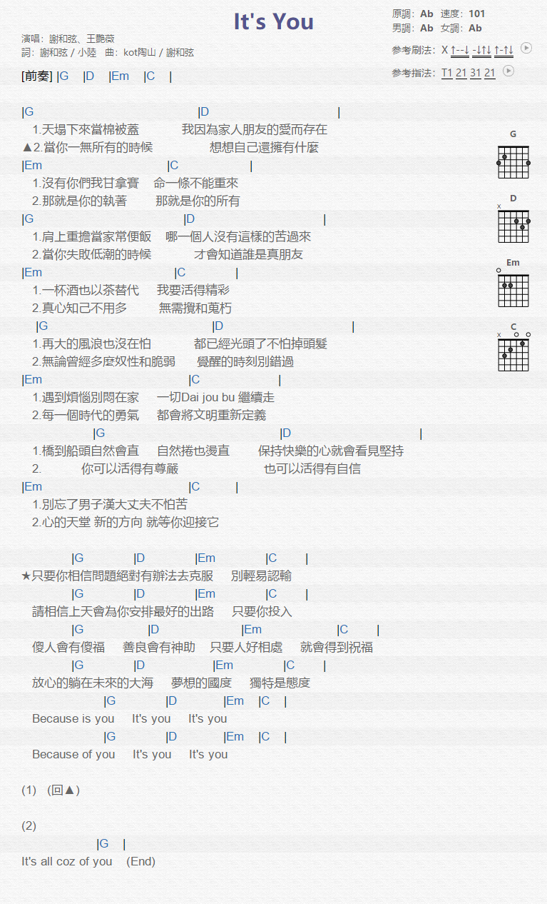 It s you吉他谱 - 谢和弦,王艳微 - G调吉他弹唱谱