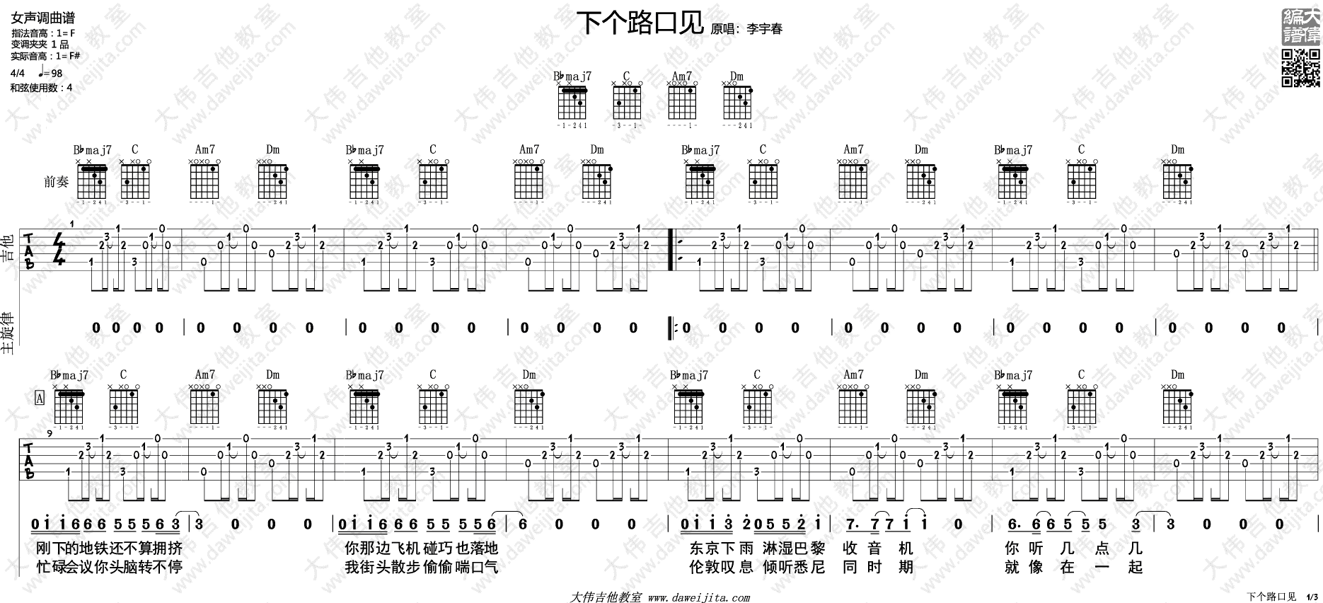 曲谱介绍: 李宇春《下个路口见》吉他弹唱谱,采用F调指法编配,共有3张高清图谱。