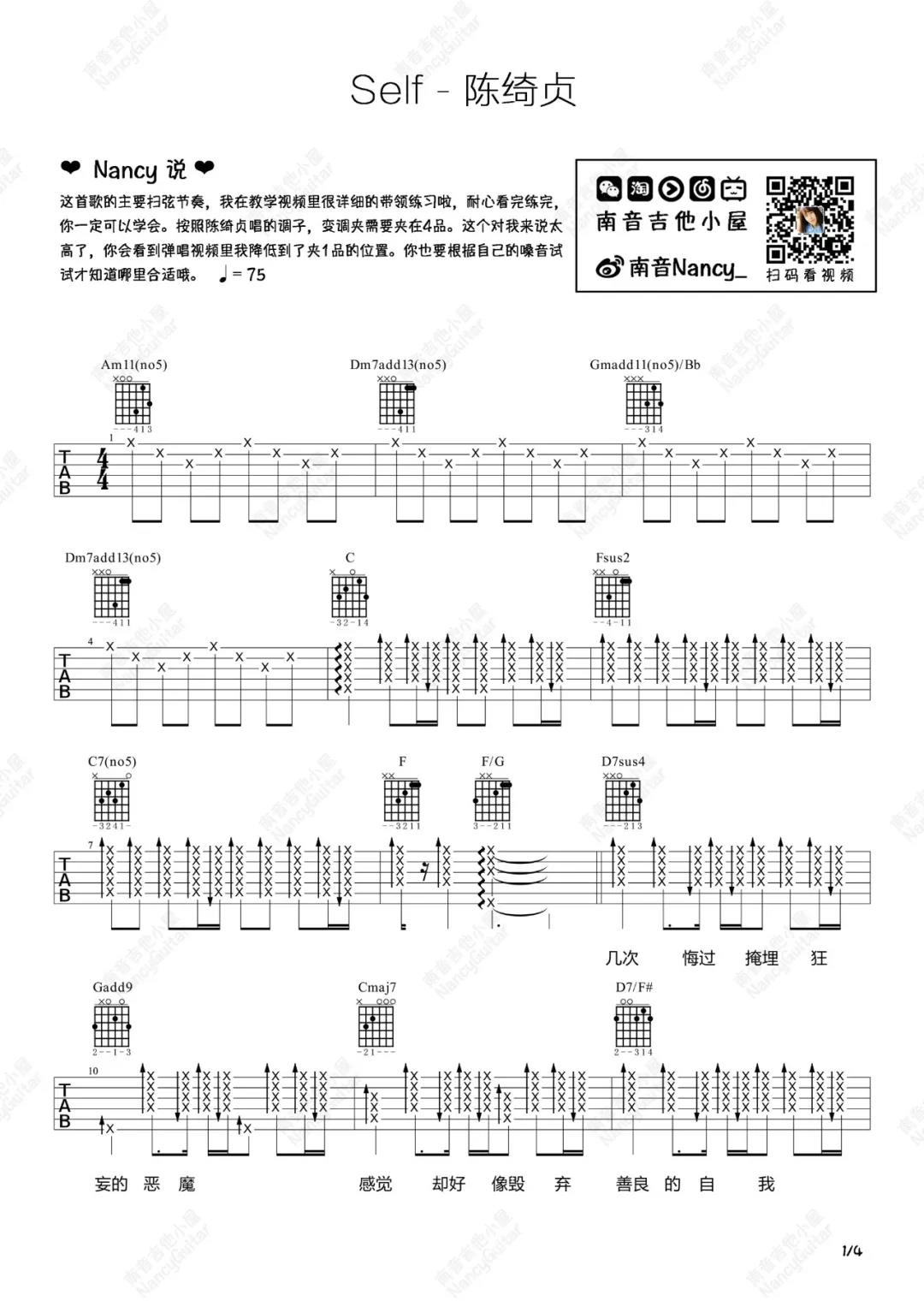 曲谱介绍: 陈绮贞《Self》吉他弹唱谱,采用A调指法编配,共有4张高清图谱。