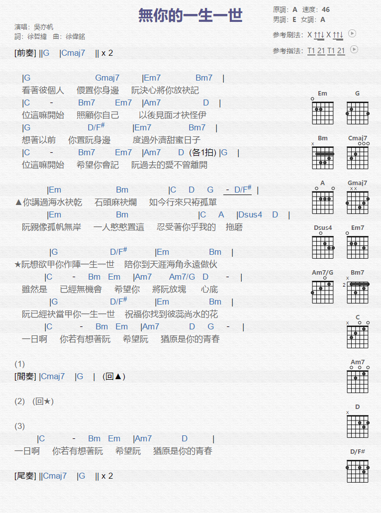 无你的一生一世吉他谱 - 吴亦帆 - A调吉他弹唱谱