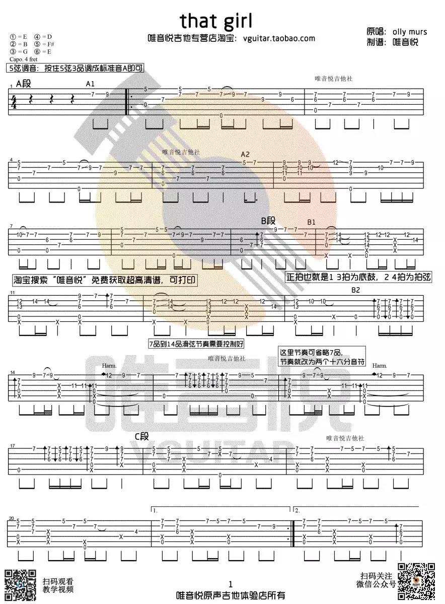曲谱介绍: Olly,Murs《ThatGirl》吉他独奏谱,共有2张高清图谱,免翻页排版设计。