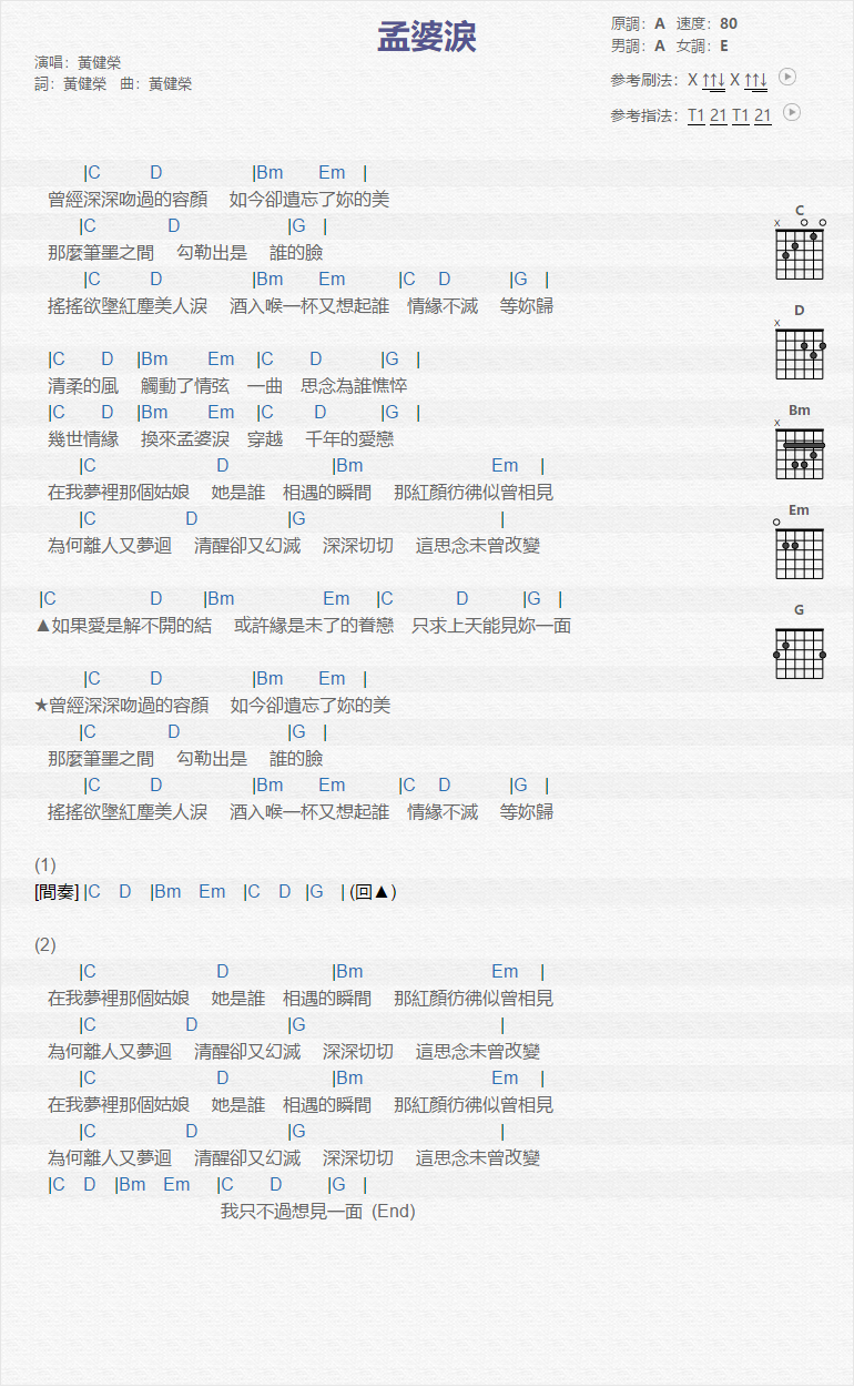 曲谱介绍: 黄健荣《孟婆泪》吉他弹唱谱,采用A调指法编配,共有1张高清图谱,免翻页排版设计。