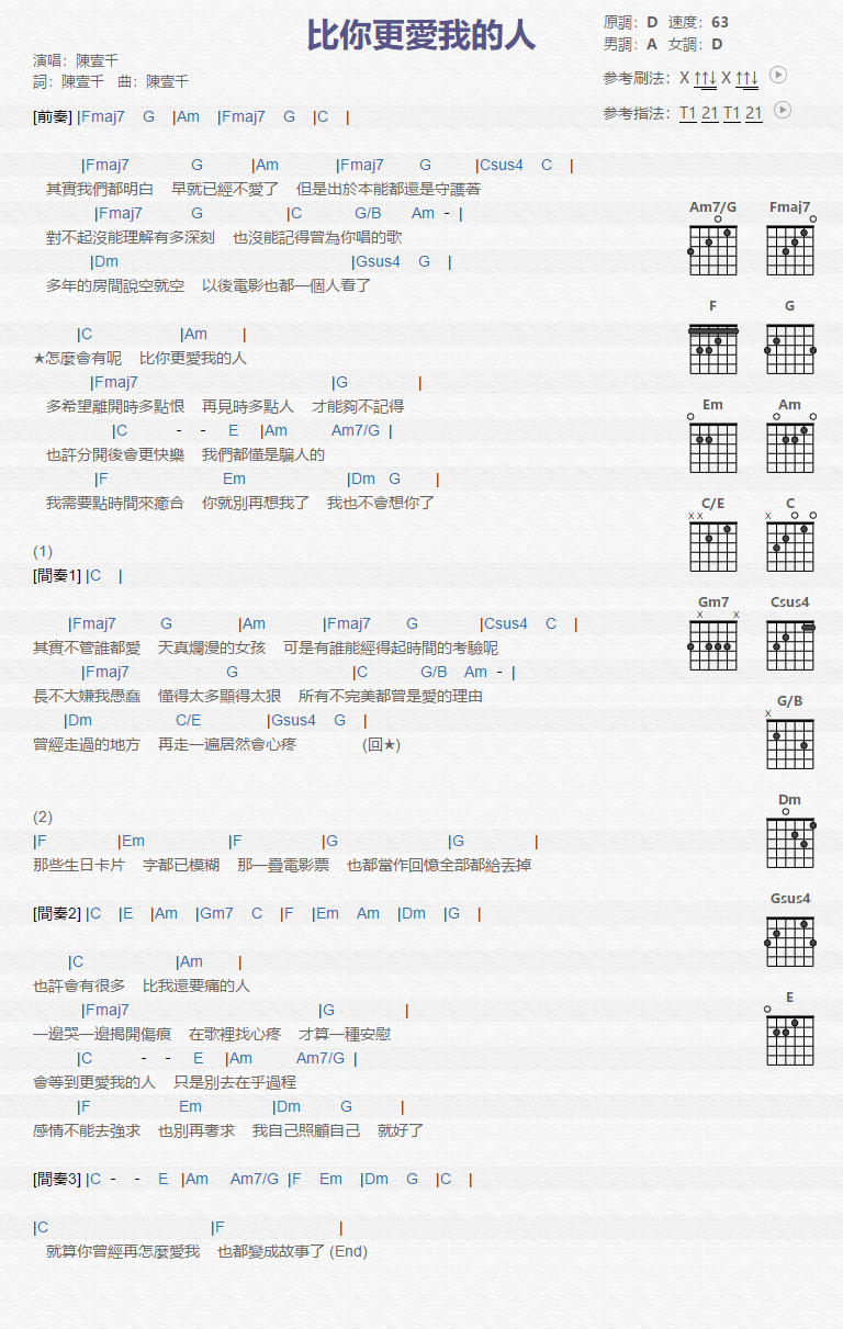 比你更爱我的人吉他谱 - 陈壹千 - D调吉他弹唱谱