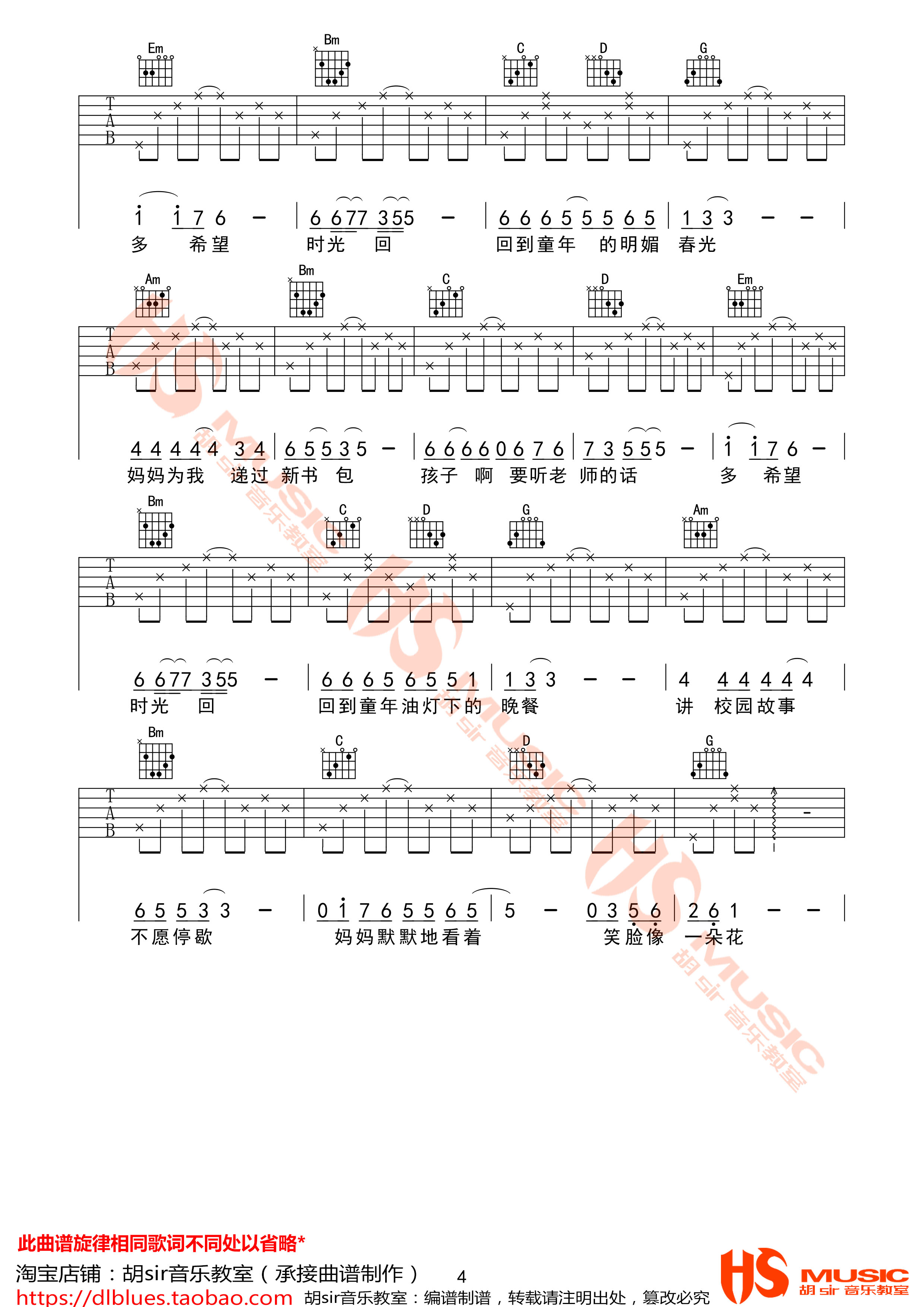 曲谱介绍: 侃侃《时光回》吉他弹唱谱,采用G调指法编配,共有4张高清图谱。