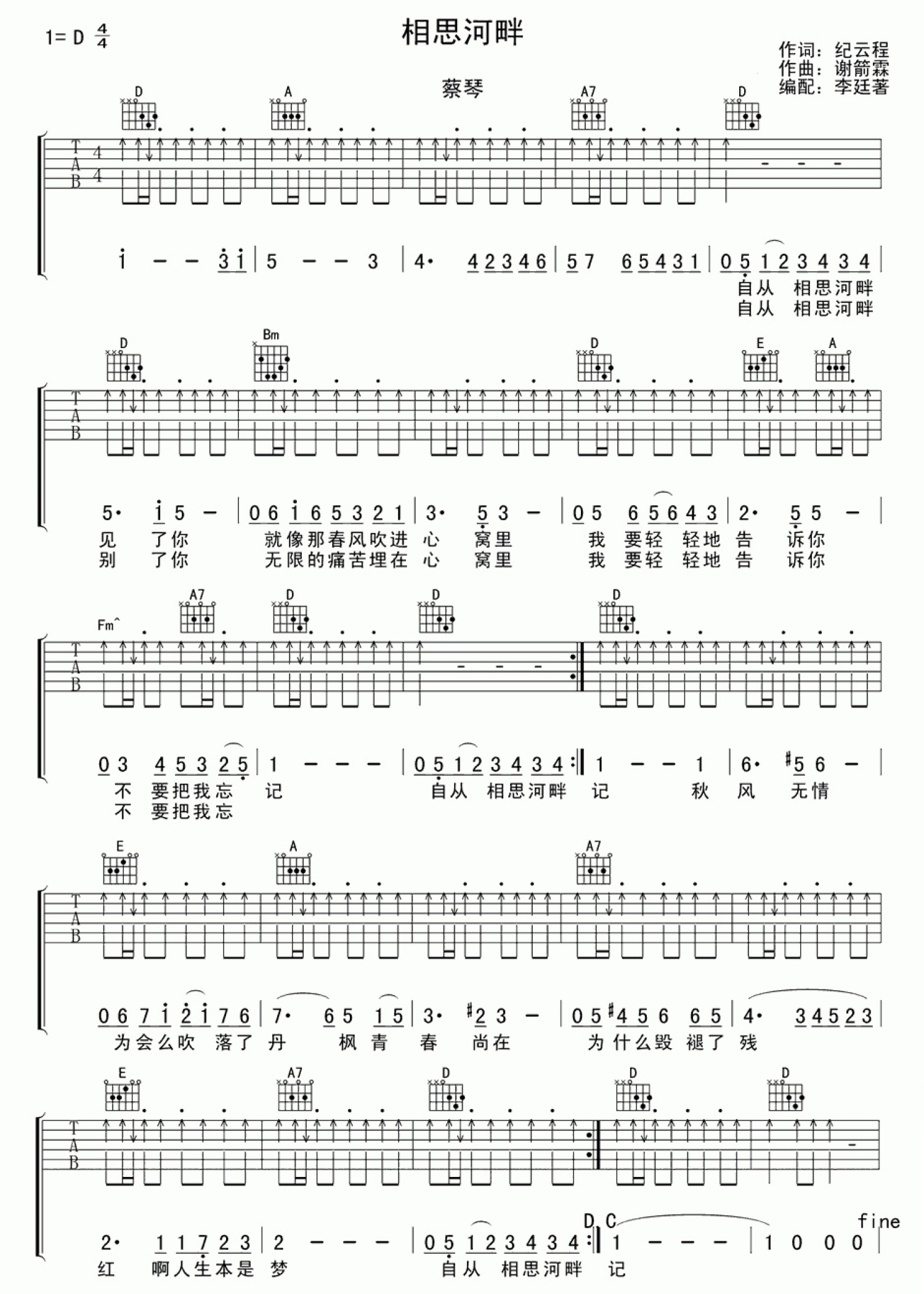 曲谱介绍: 蔡琴《相思河畔》吉他谱_D调吉他弹唱谱