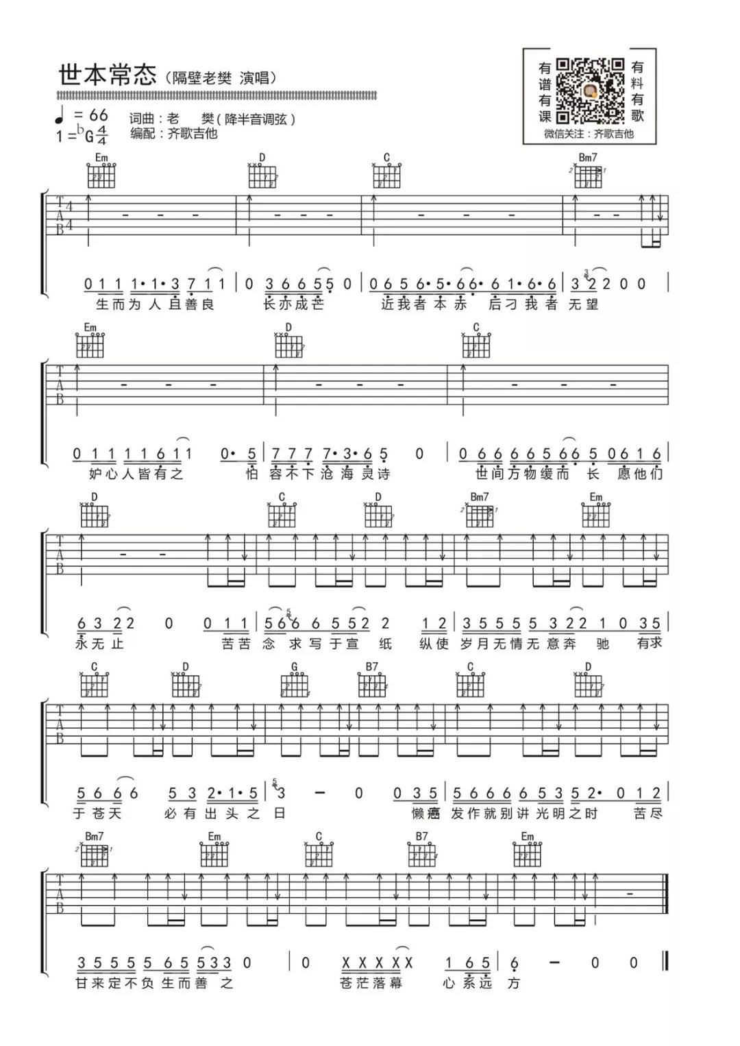 曲谱介绍: 隔壁老樊《世本常态》吉他弹唱谱,采用G调指法编配,共有1张高清图谱,免翻页排版设计。